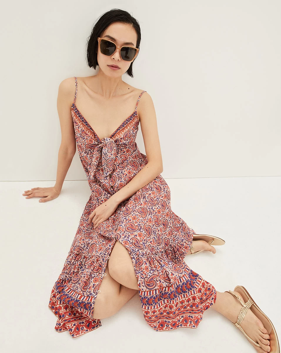 Turn heads wherever you go in the bohemian-style Abilene dress. A front cutout, a flounced skirt and a charming bow at the neckline complete the look of this drop-waist paisley style. Made from lightweight cotton voile, this is the perfect vacation go-to—great as a cover-up for day, effortlessly chic with heels for night.