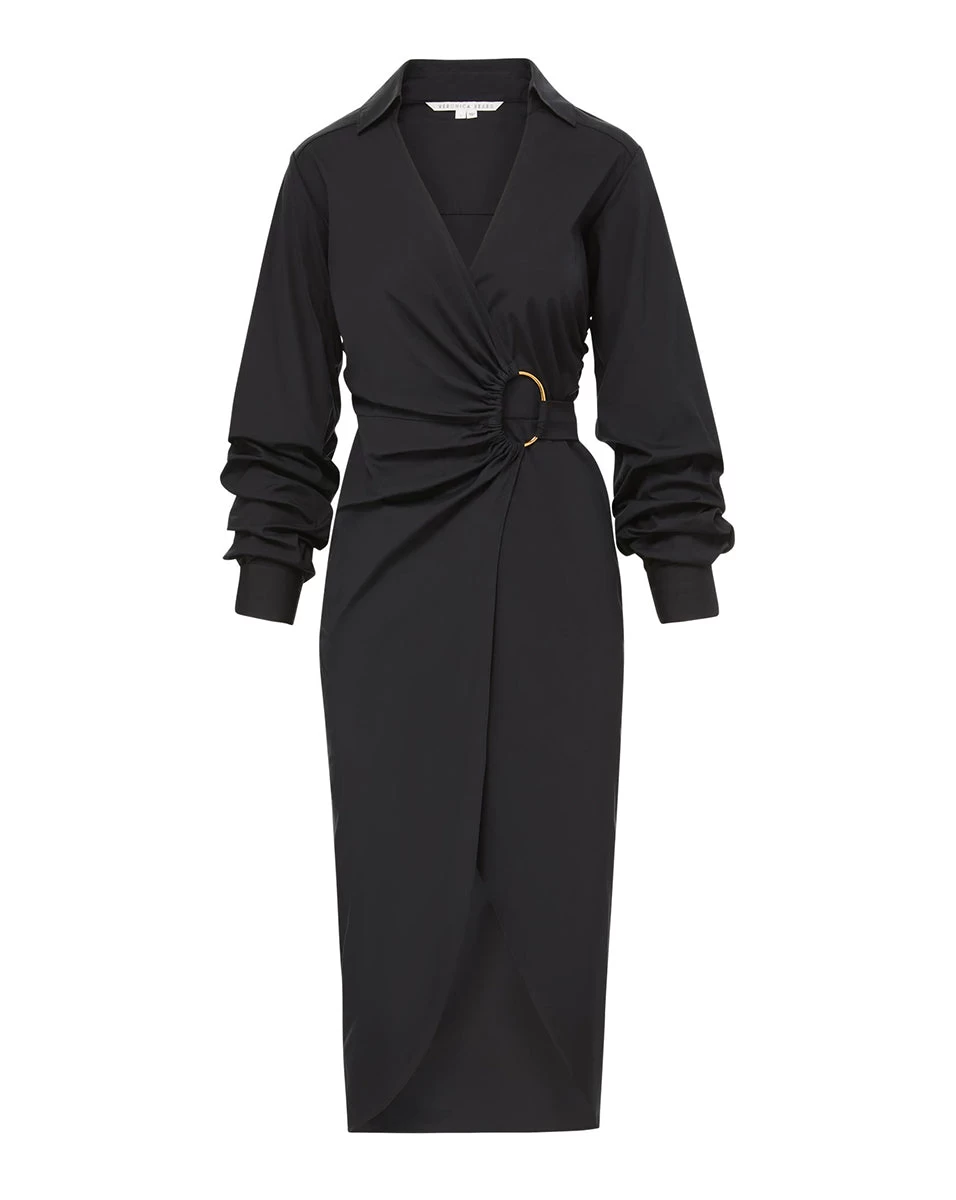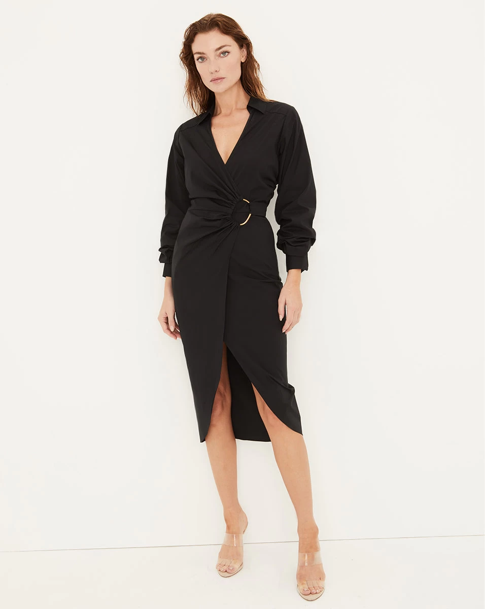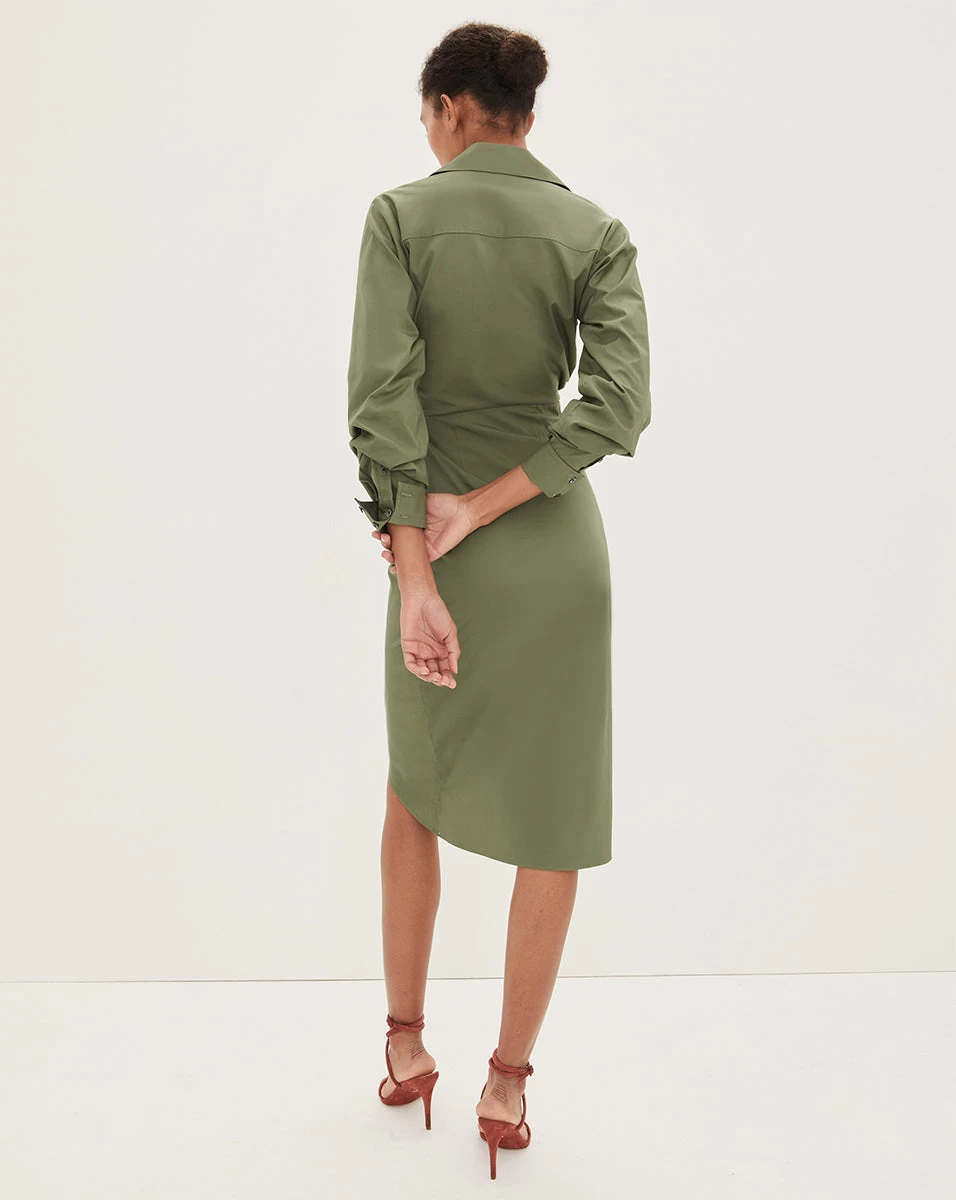 Meet the Afton, the ultimate day-to-night dress. Made from stretch cotton, this feminine silhouette flatters the figure with a wrap-style waist and tulip skirt. D-ring hardware, a V-neck collar and cuffed blouson sleeves complete look. Style with heels, loafers or flat sandals—this is as versatile as it is chic.