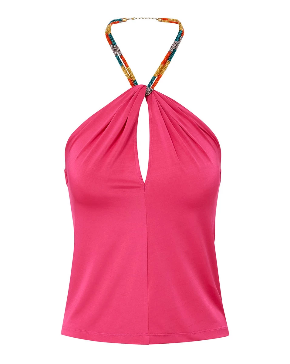 Meet Akeeva: a keyhole halter—with a twist. An intricately beaded multi-colored halter strap adds a far-flung feel, while a ultrasoft jersey cuts a body-skimming silhouette. Its vibrant hues make this style an instant vacation favorite. Pair it with high-waisted shorts and sandals for your next getaway.