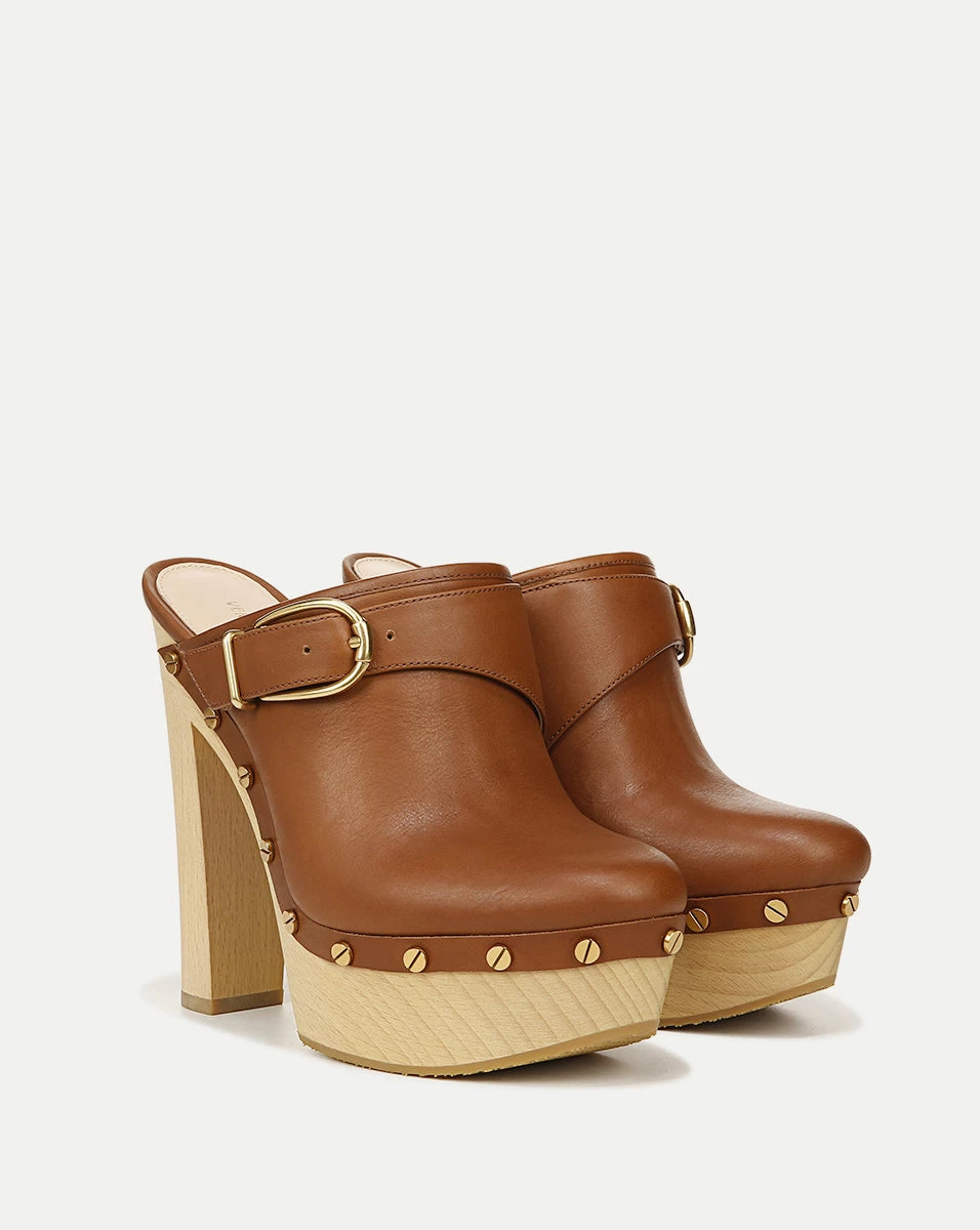 Our best-selling clog, elevated. With a classic wooden platform and 5.5” heel, the Alek features a smooth hazelwood leather upper and gold-tone studs at the edge—making this both timeless and fashion-forward. A cushioned footbed and an adjustable buckle strap complete the look. Pair with a sharp pantsuit or style with your favorite floral dress.
