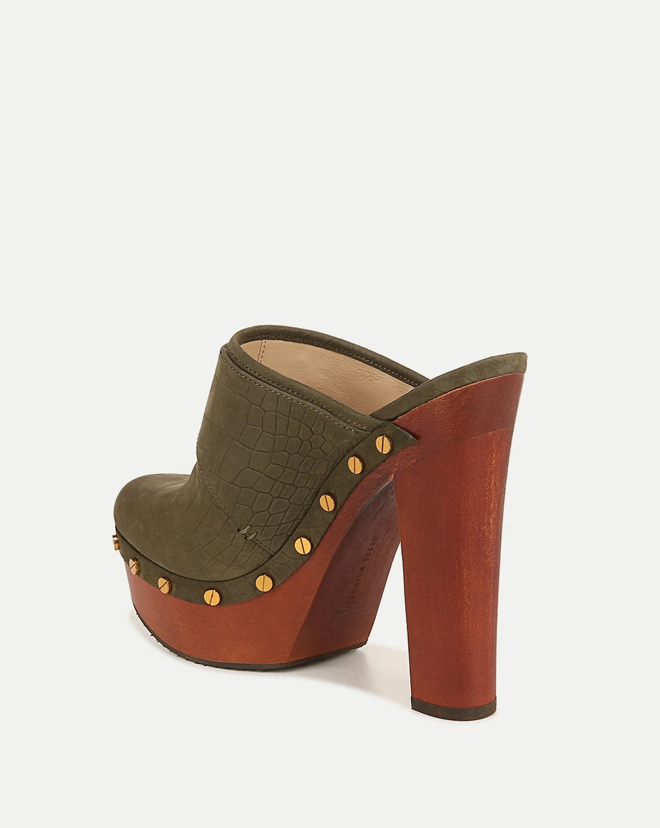 Our best-selling clog, elevated. With a classic wooden platform and 5.5” heel, the Alek features a croc-embossed vamp and gold-tone studs at the edge—making this both timeless and fashion-forward. A cushioned footbed and an adjustable buckle strap complete the look. Pair with a sharp pantsuit or style with your favorite floral dress.