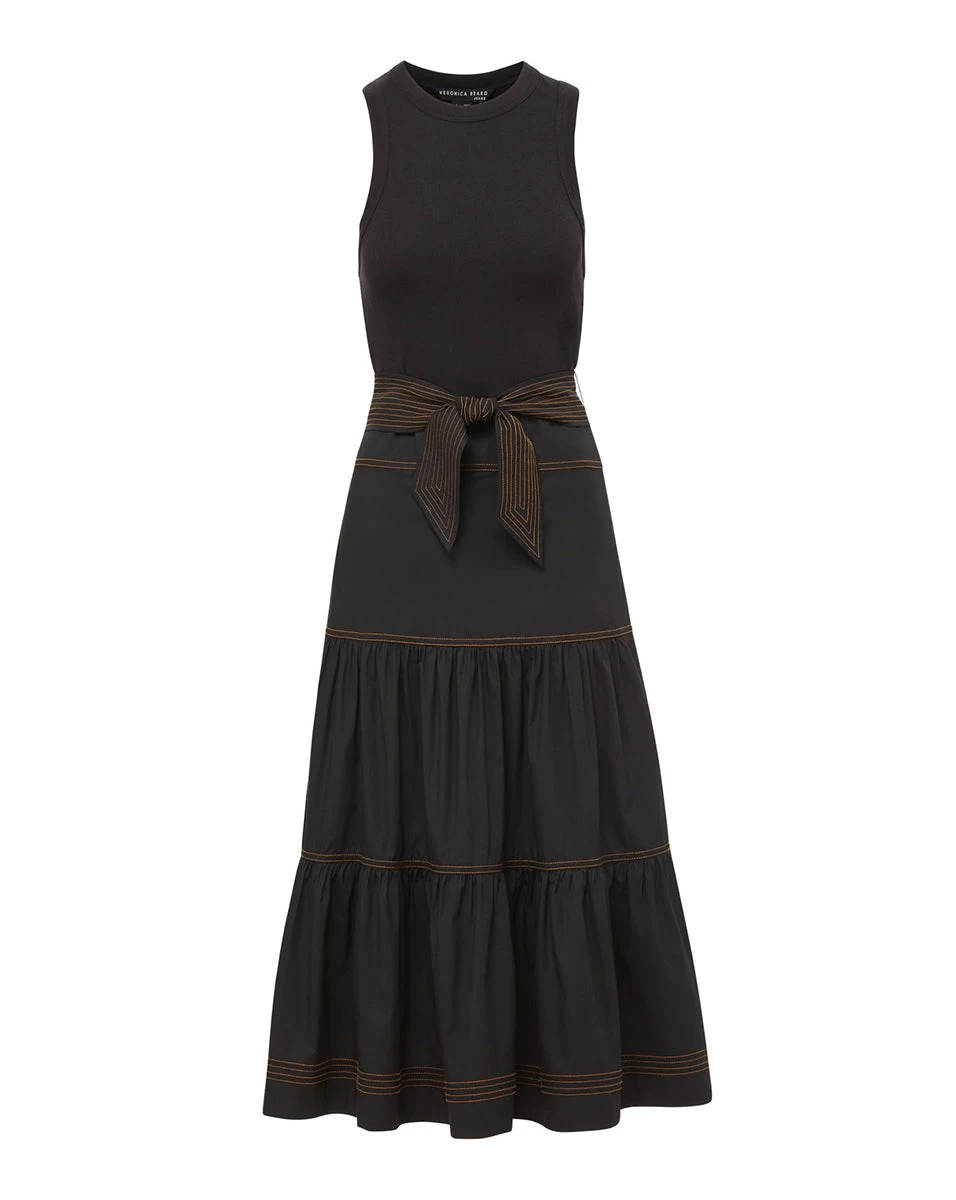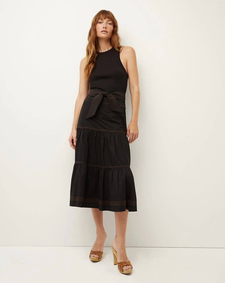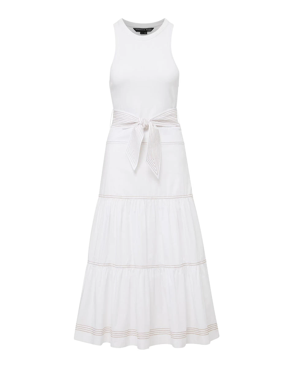 The Austyn is the newest addition to our best-selling series of mixed-media garments. Pre-layered for maximum impact, minimal effort, the dress combines a tiered, flounced maxi skirt with a ribbed tank; a tie at the waist adds definition. Keep the look refined with strappy sandals and polished gold jewelry.