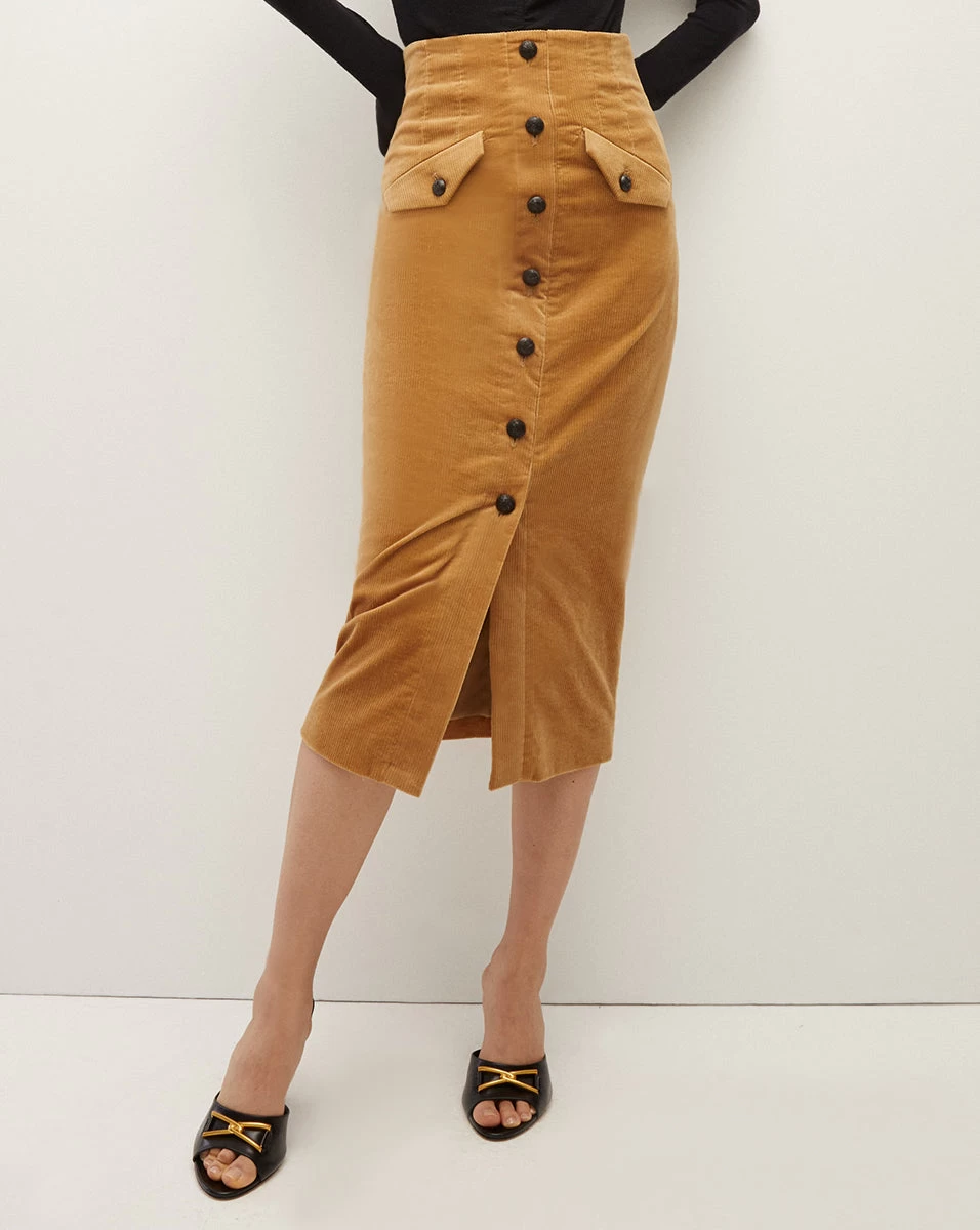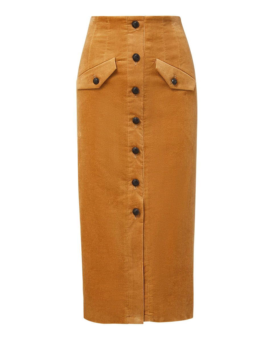 Cut from a cotton-stretch corduroy for the ultimate in both structure and comfort, the Barrie skirt is your answer to luxe dressing with all-day wearability. Detailed with a corset-inspired waistline, black leather wrapped buttons, and flap pockets, this button-down style hits just below the knee, making it perfect for days that start at the desk and end with drinks. Style it with just about anything in your closet—from tanks to silk blouses, it’s a versatility MVP.