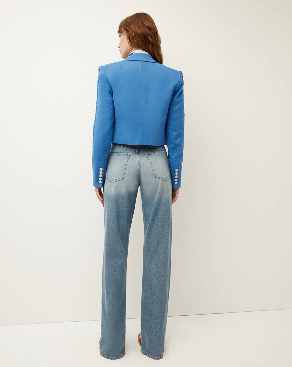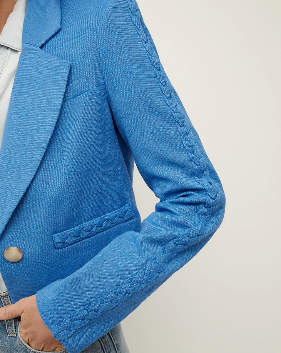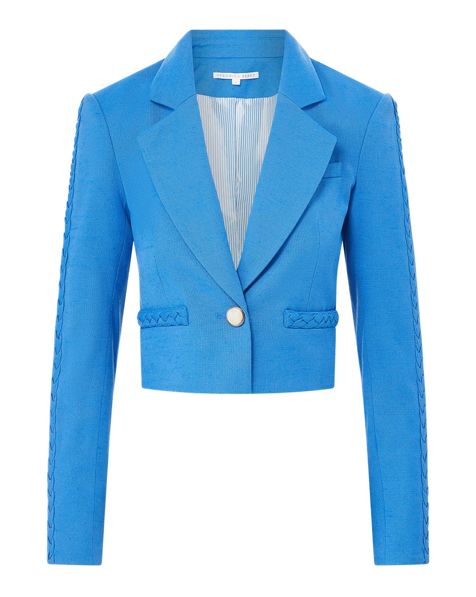 Meet the Behren in bold azure, our fashion-forward take on the cropped jacket. A masterclass in precision tailoring, this single-breasted style features a trim, boxy fit, padded shoulders and decorative braiding along the pockets and sleeves. A wide notched lapel and a statement crest button complete the look. Pair with jeans for daytime polish or layer over a minidress for a glam night out.
