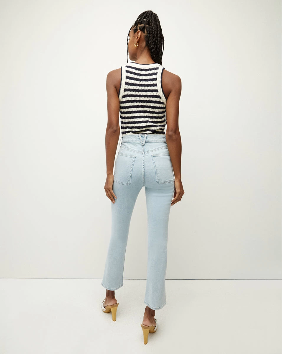 The Carly is a VB favorite, now updated with front patch pockets. Everything else you love about the style remains the same, including the skinny-flare leg that’s fitted through the hips and thighs. Made in LA from premium Italian denim, these jeans give you a flattering fit and a quick recovery. Pair with a tee, a dickey jacket and clogs for a classic VB look.