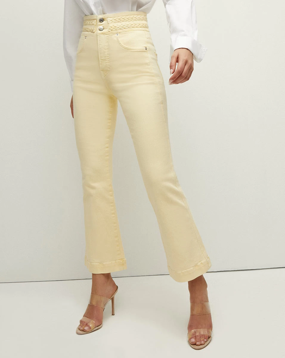 Meet the Carson, our classic high-rise flare, now updated in a pale-yellow denim and a double-braided waistband. Made in LA with premium Japanese denim, this VB favorite features a slim fit and slightly cropped length. Style with a tee and sneakers for day; dress it up with a jacket and heels for nights out.