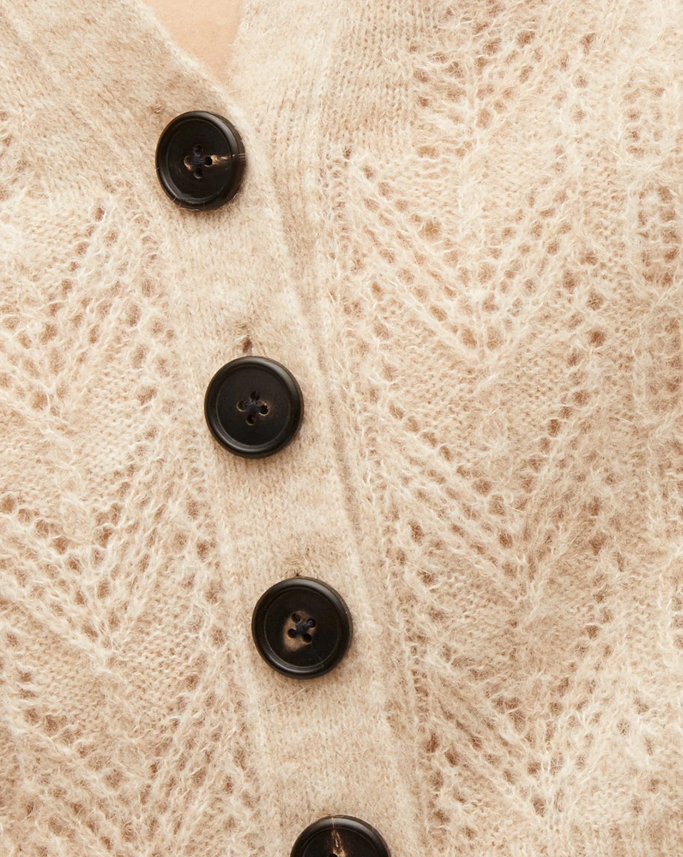 Crafted in a luxe baby alpaca blend, the Italian-spun Delent cardigan is cozy-soft yet lightweight. It has a slim fit, making it a true layering essential. Knit in a mixed pointelle stitch, its chevron patterned weave gives it a polished look. Wear it open over a tonal tee, or its coordinated vest.