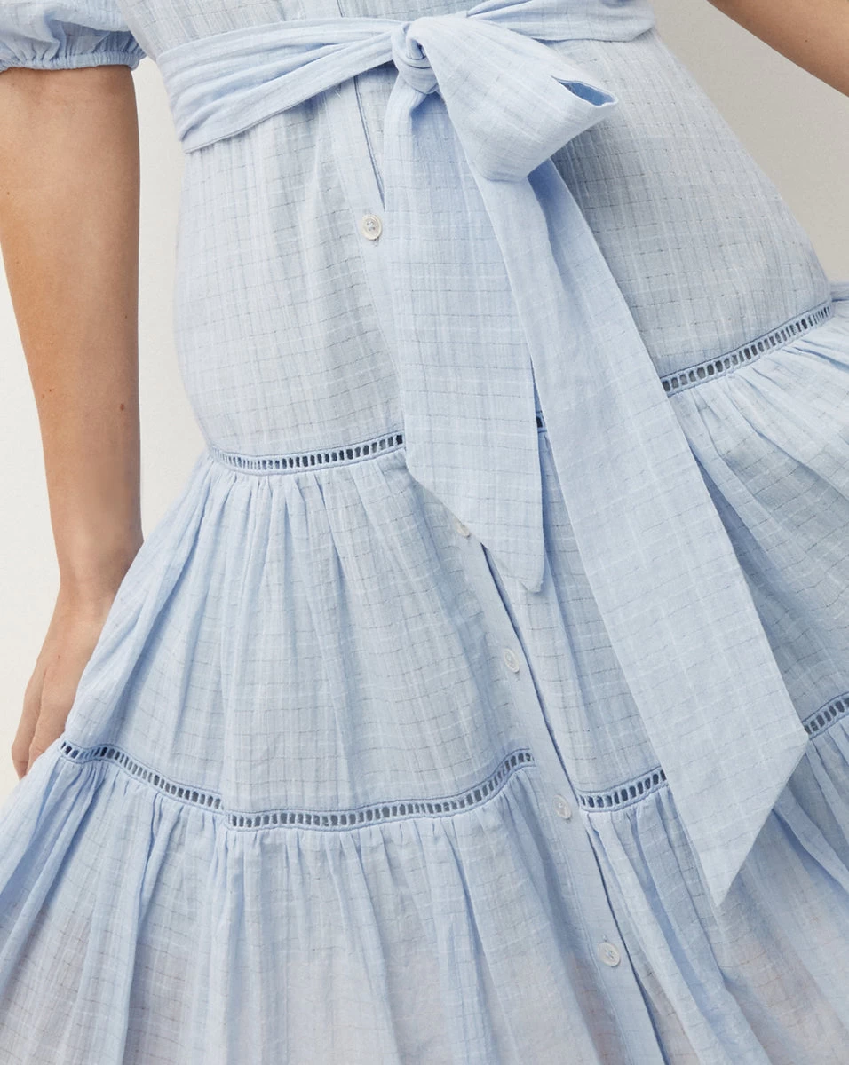 Made from 100% breathable cotton, the Dewey will be your new effortless go-to. Cut for a relaxed fit, the dress features gently puffed sleeves with elasticized hems and a tiered skirt with ladder stitching. Front-button closures and a detachable tie belt at the waist complete the look of this must-have piece. Pair with sandals or, for a cool, downtown take on everyday style, with sneakers.