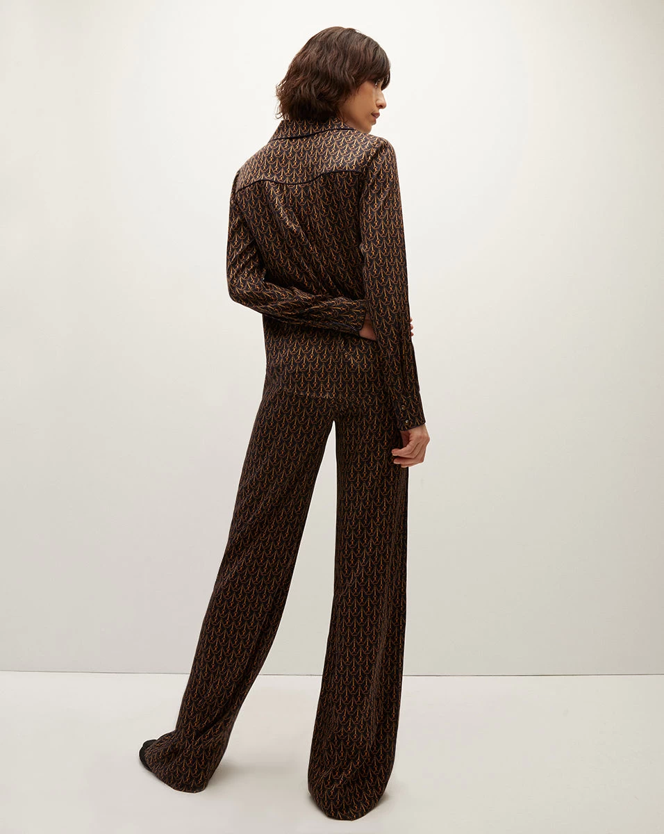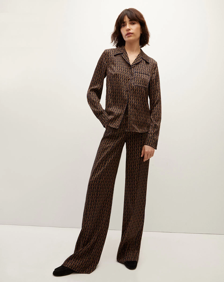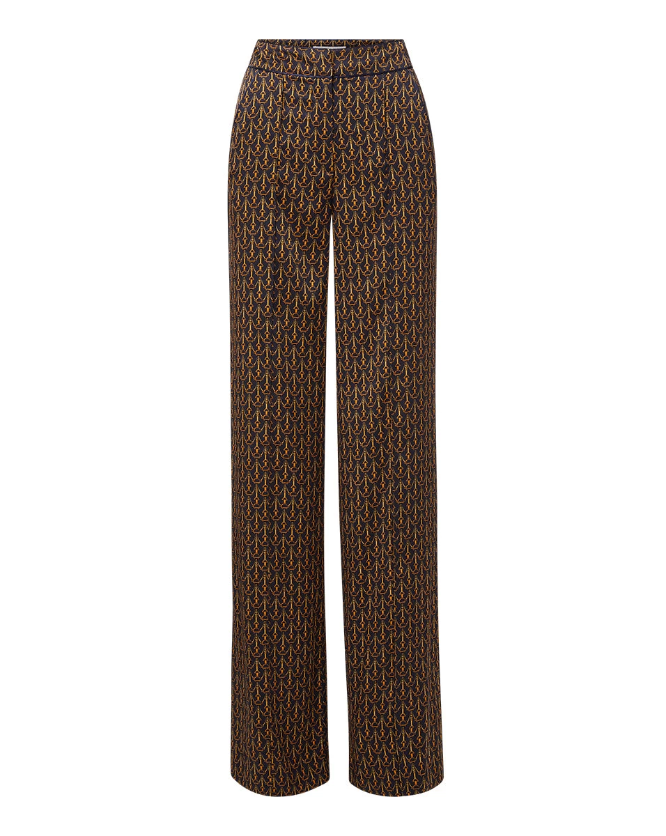 A marriage of comfort and sophistication, the Edia is a refined take on pajama dressing. Defined by its elegant wide-leg shape, silky body and a conversational equestrian print, the Edia pant offer an understated glamour and ease to your daywear. Contrast piping and a concealed zip and hook closure finish the look. Complete the look with its coordinating top, strappy sandals and cat-eye sunglasses.