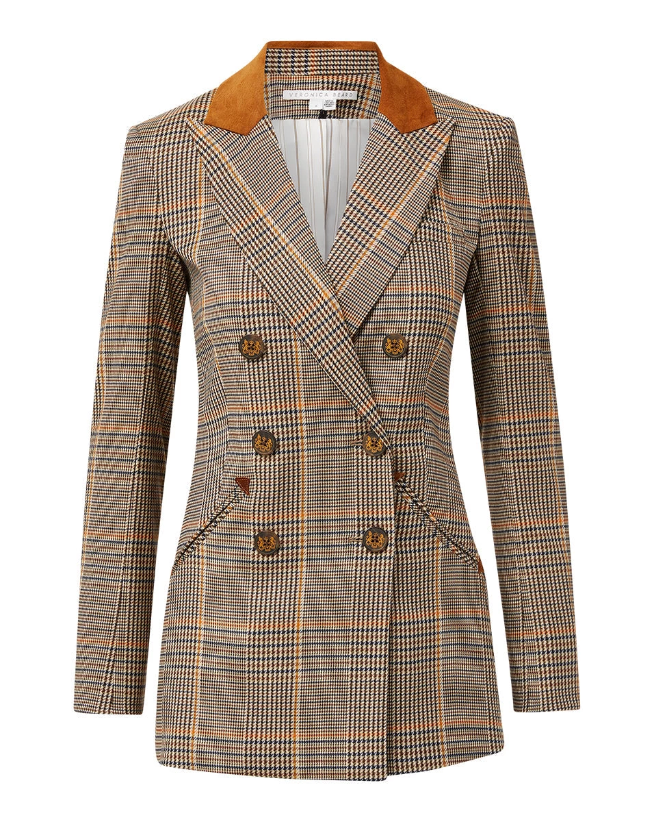 A longline blazer always exudes polished self-assurance and the Elvana, with its classic plaid check, does that and more. Modeled off heritage plaid jackets, this feminine take on classic menswear suiting is designed with a double-breasted silhouette, a 100% lambskin suede collar, and crest buttons. Thoughtful precision tailoring optimizes the flattering factor—an elongated silhouette and a nipped-in waist emphasized by slit pockets. Pair with its coordinating skirt or try it over a skinny-leg jeans.