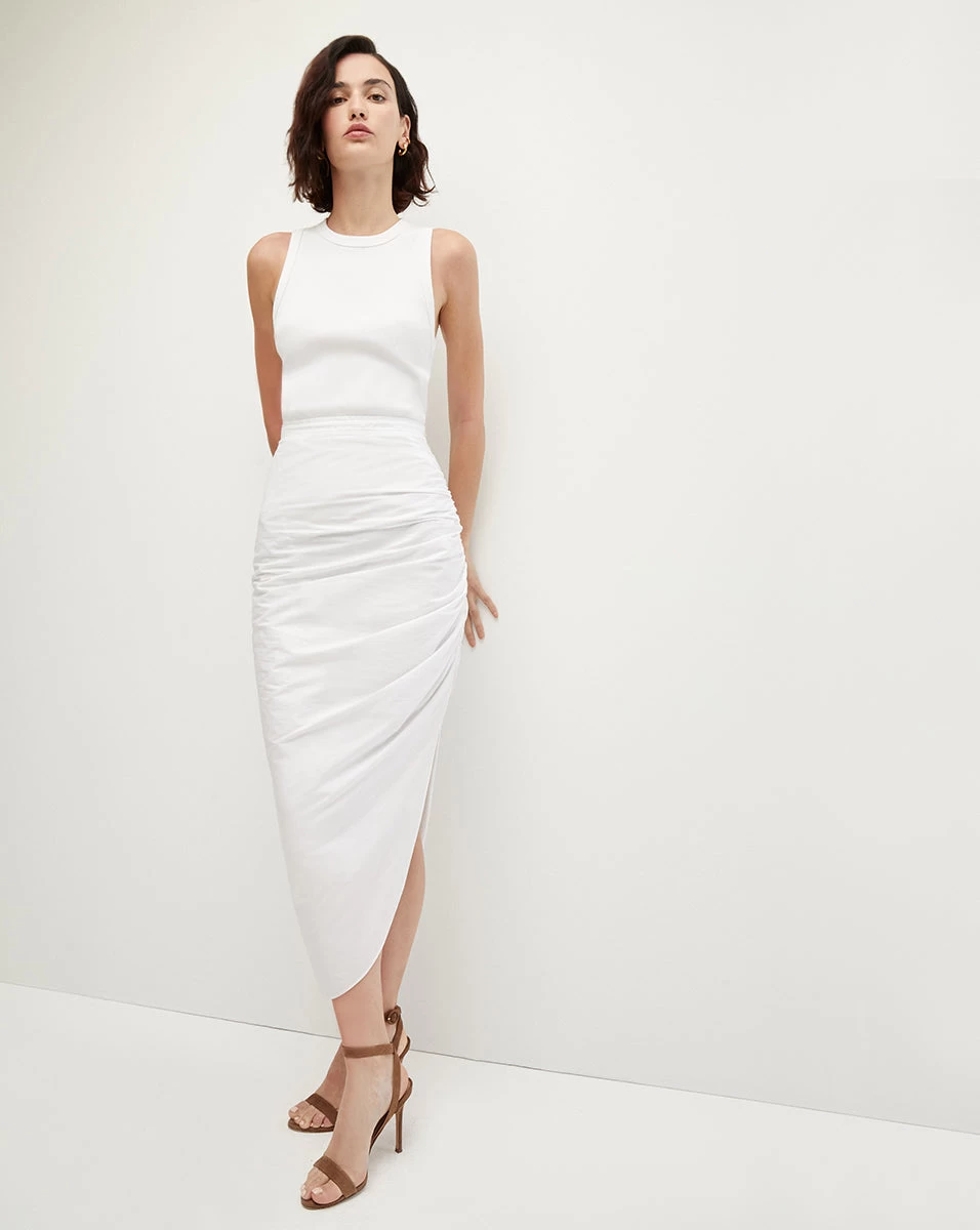 Made for summer nights. A combination of two different cottons—a ribbed tank with a touch of stretch up top; a crisp poplin skirt on bottom— the Finca mixed-media dress gives the illusion of two pieces in one. Perfect for day-to-night dressing, this fresh and chic style also features our signature ruching down the side of its asymmetrical midi skirt, creating that figure-flattering finish we’re known for. Reach for the Finca on days you want to look elevated without any effort; just add your favorite sandals and go.   Â