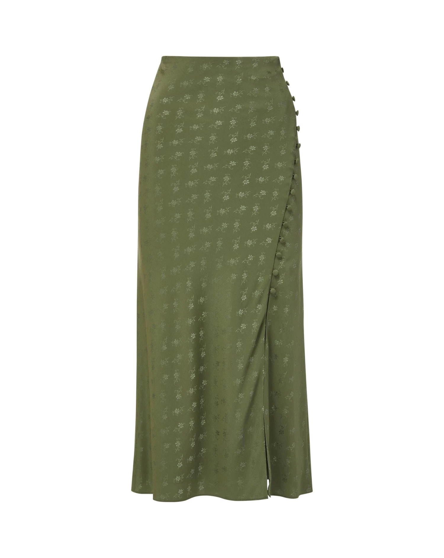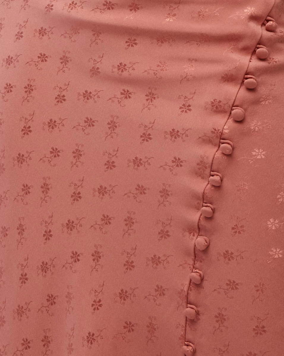 Cut from a fluid custom floral jacquard silk, this wrap-style skirt is the wear-everywhere skirt to take you through summer. With a high-waist and an easy fit, it’s falls to a midi hemline. Asymmetrical tonal fabric-covered buttons finish the look. Style it with a simple tank and slides for a Nineties-inspired look.