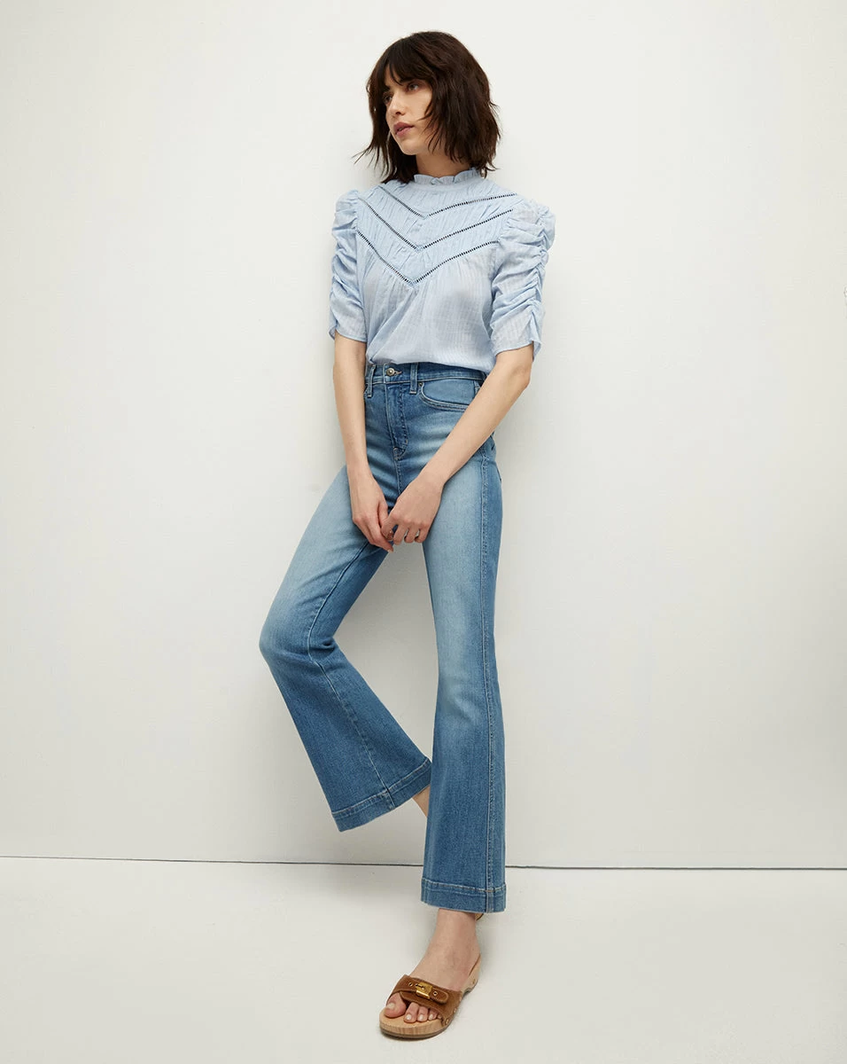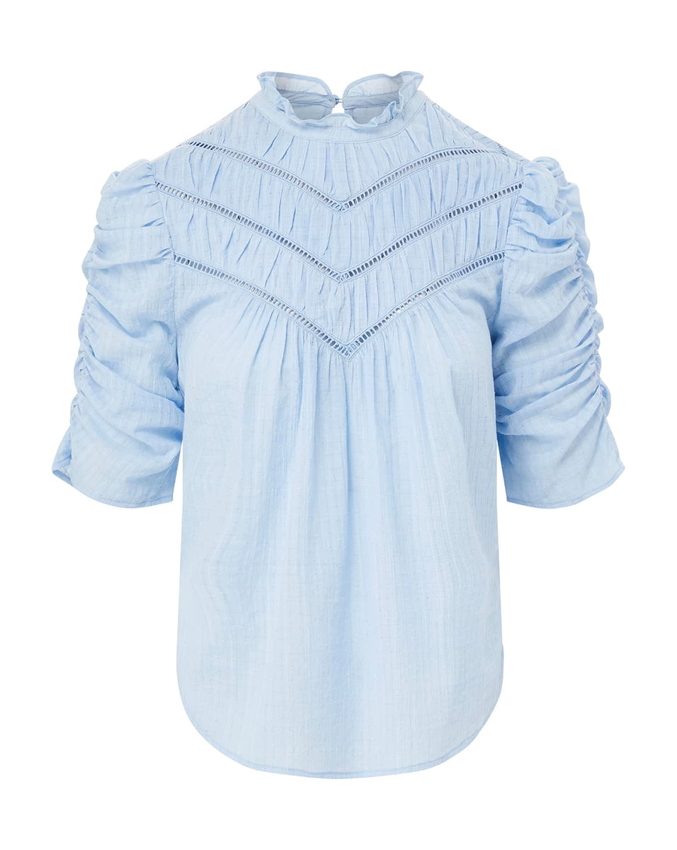 Made from 100% textured cotton, the Frasier top is our modern spin on bygone Victorian romance. Cut for a relaxed fit, this summer go-to features ruched detailing, including on the puffed sleeves, as well as a ruffled mock neck. Intricate ladder stitching across the front yoke completes the look. Pair with denim for everyday elegance or up the feminine ante with a gathered skirt.