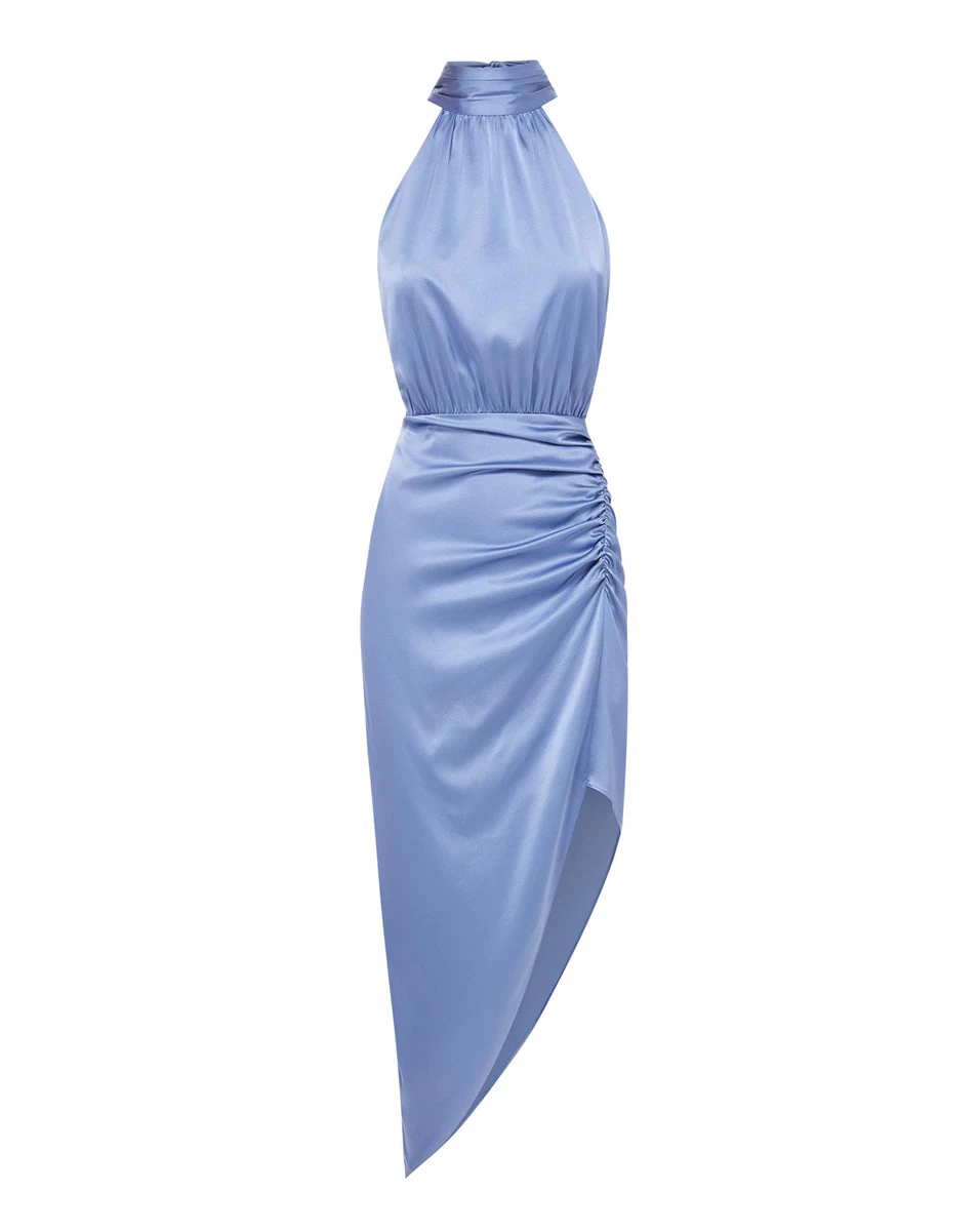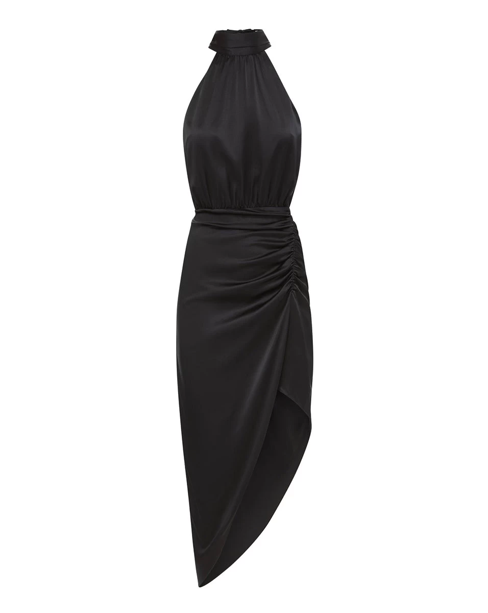 The Gabriella is the height of sophisticated eveningwear. This halter dress is cut a from a stunning silk charmeuse with a slight stretch for ease of movement and a fluid hand-feel. Our signature side ruching flatters and forgives where you need it while the asymmetrical hem offers a sleek-but-sexy finish. This is the little black dress your closet will thank you for. Pair it with classic heels for your next night out.