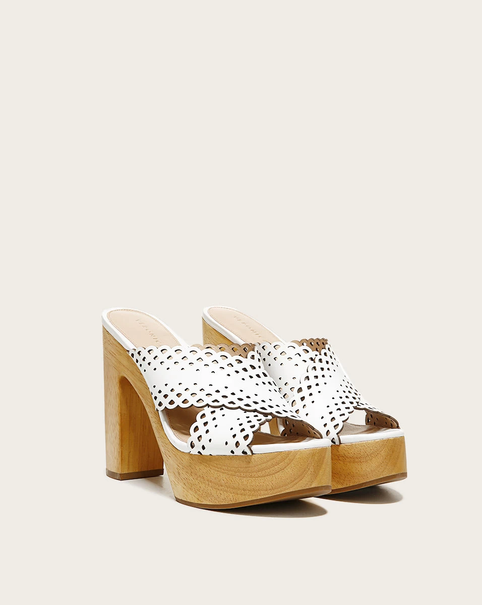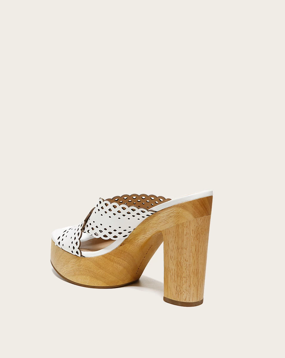 A crisscross vamp with lasercut, scalloped trims give our towering Gaynor sandals their must-have appeal. A woodgrain platform and heel complete the look of this vacation-ready shoe—just slide them on to instantly elevate your outfit.