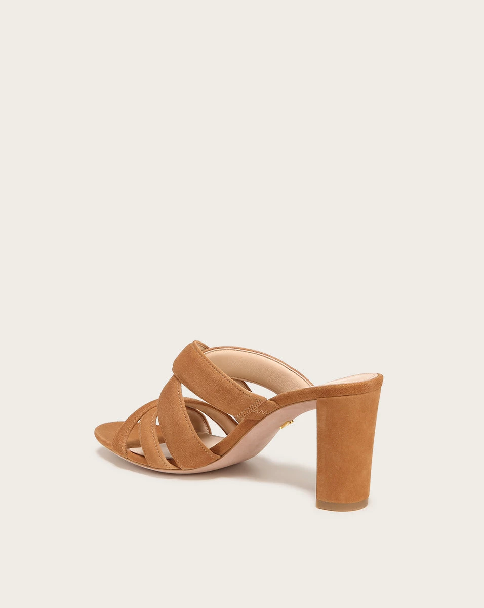 Crisscross straps and a 3″ block heel define the look of our versatile Ginny sandals. Slide into this effortlessly cool style for instant-chic. In classic camel suede, this pair will be loved and worn for years to come.