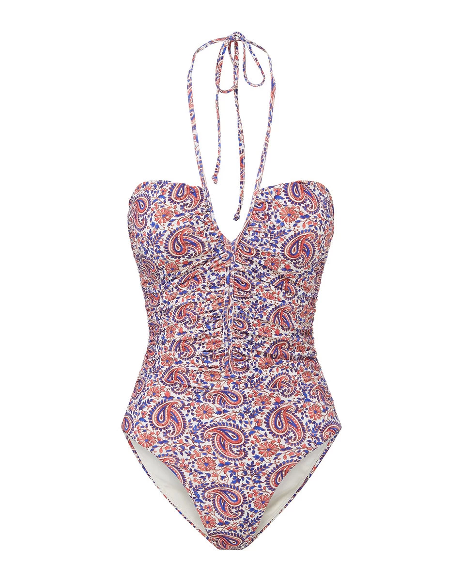 Our signature ruching and a split-V neckline define the Hazina one-piece, creating a flattering, feminine silhouette. A vibrant paisley print ups the fun factor while adjustable ties in the back keep you secure. Wear with your favorite cover-up or sarong and finish with strappy sandals.