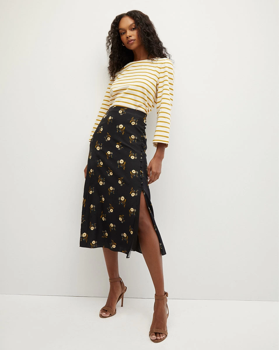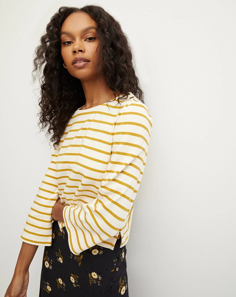 No summer wardrobe is complete without the perfect striped shirt—this is it. Cut for a relaxed fit from 100% cotton, the Hovey features mariner stripes in sunshine yellow and three-quarter-length sleeves. With decorative buttons along the shoulders for added style and detail, this timeless piece will pair well with anything and everything—jeans, skirts, pants, blazers, you name it.