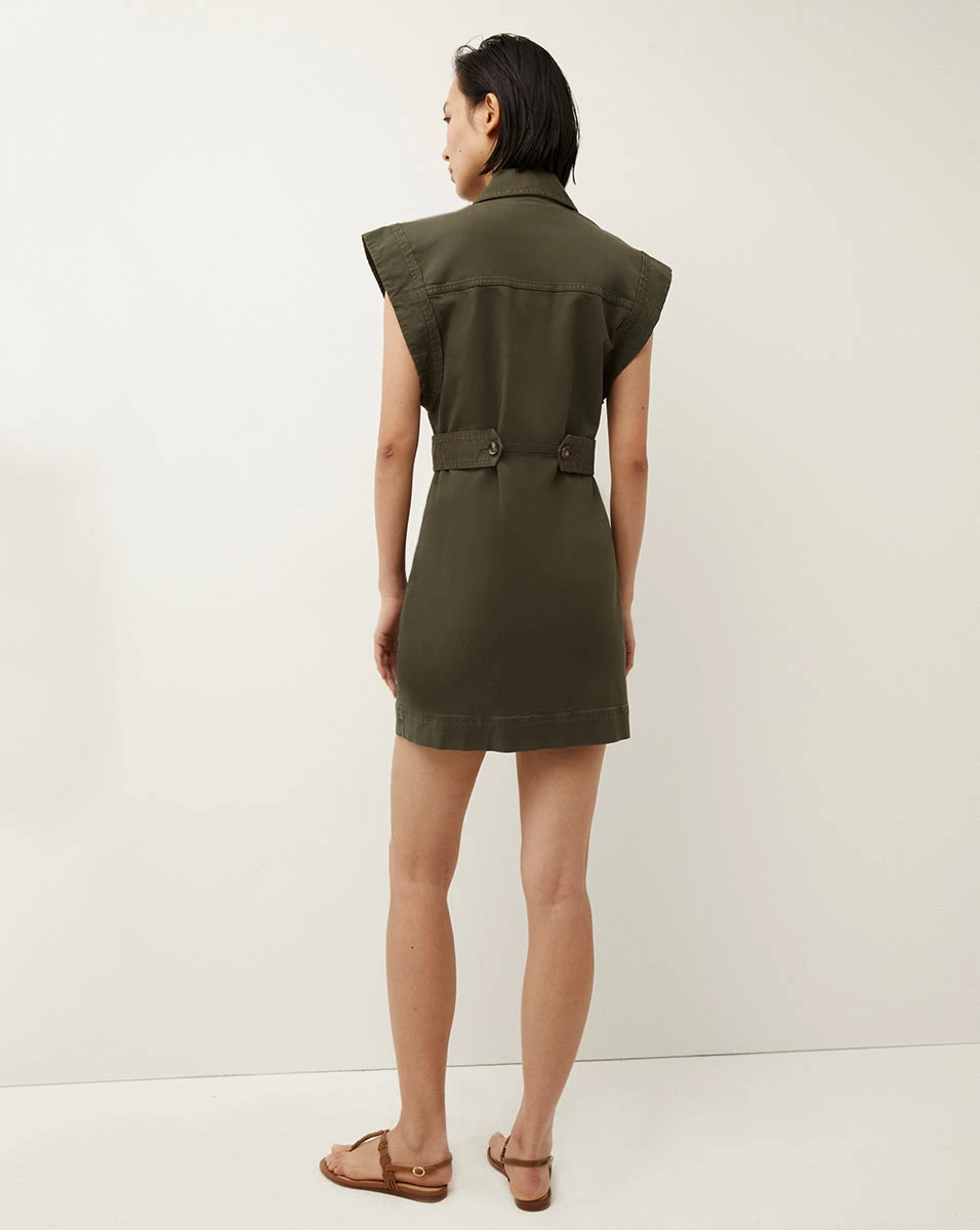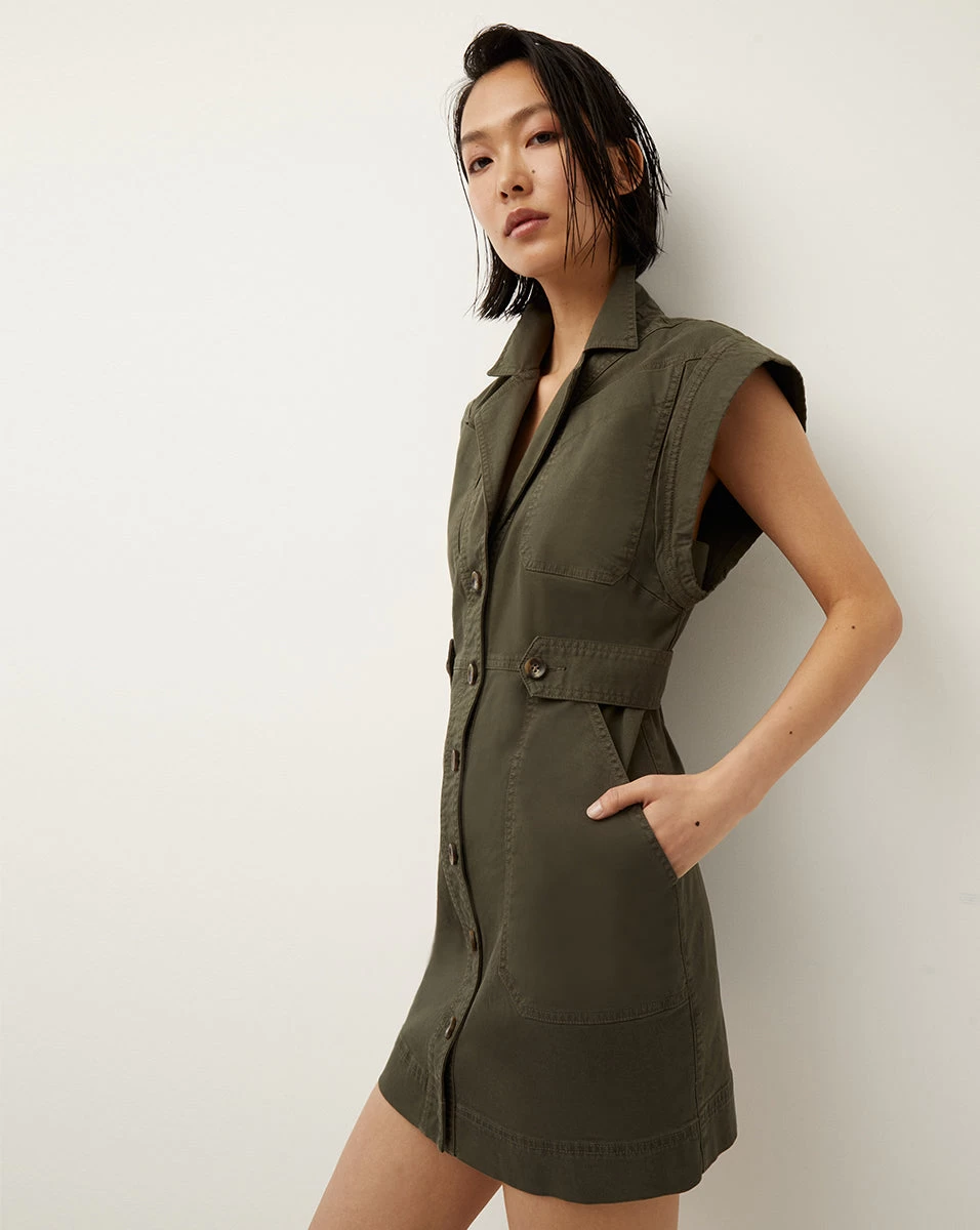 A modern, utilitarian take on the classic shirtdress. Crafted from a crisp poplin-blend, it balances the masculine with the feminine with its flirty, mini length. A notched lapel adds polish while waist-tabs create a waist-cinching, slimming effect. Large patch pockets finish the look. Pair it with sandals for an easy night-out outfit.