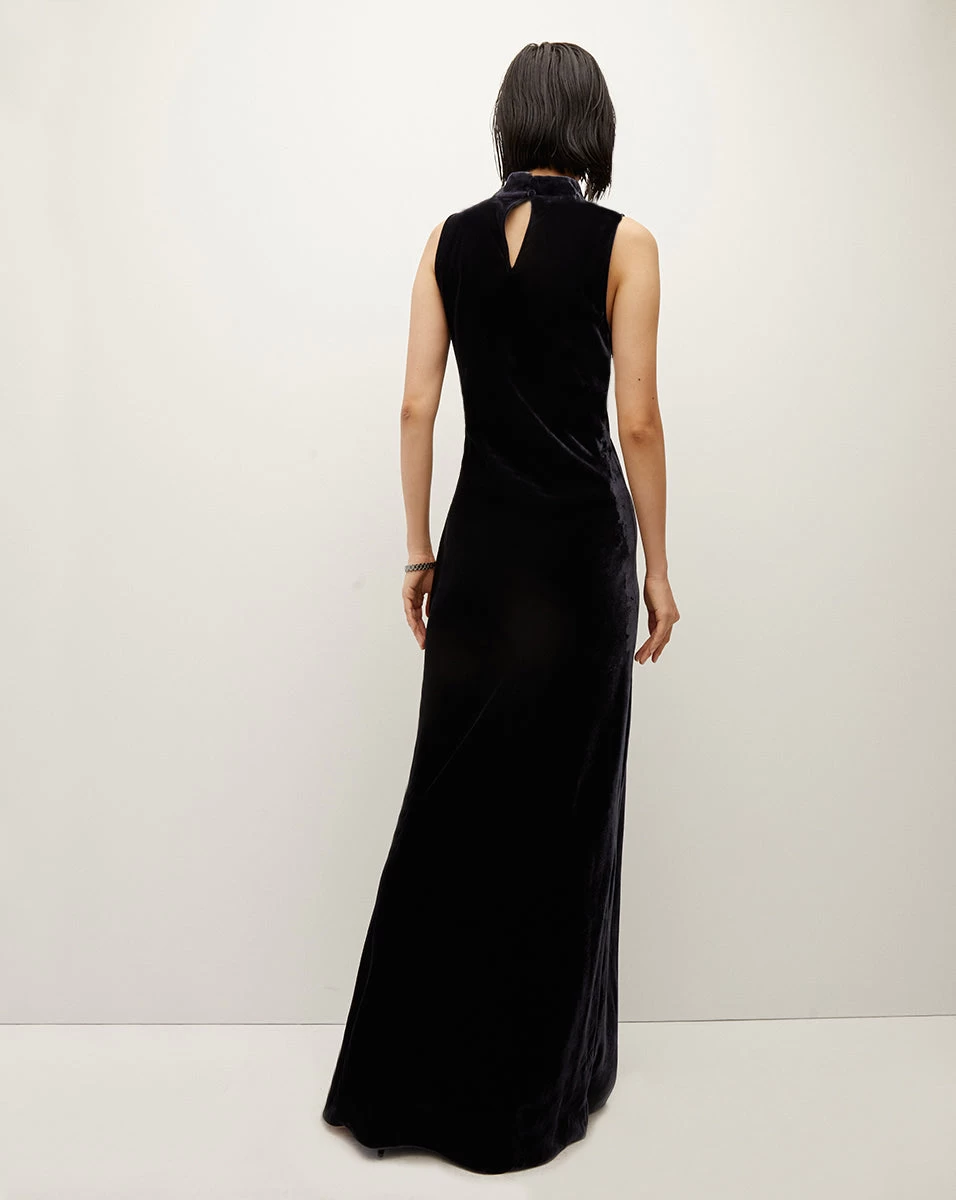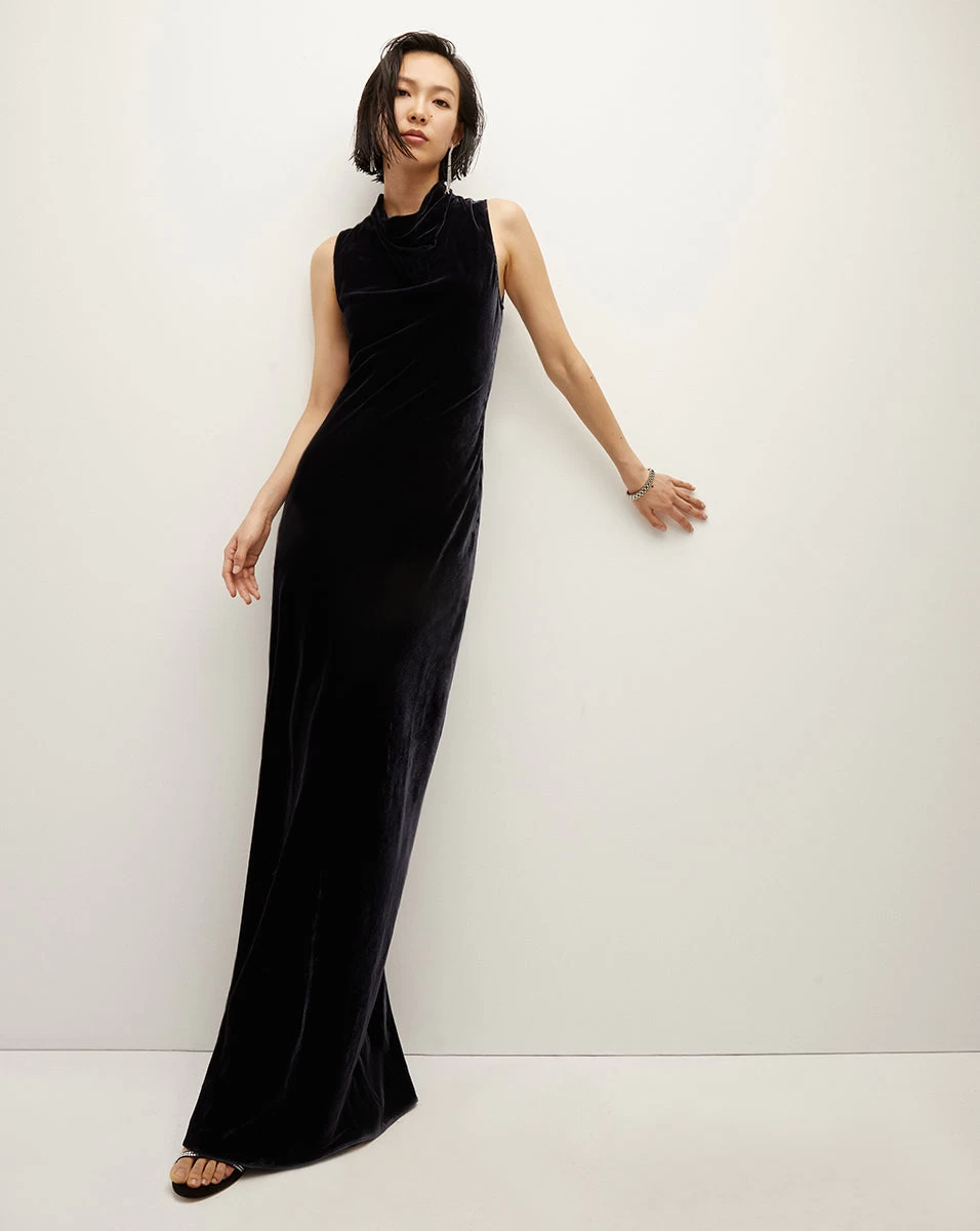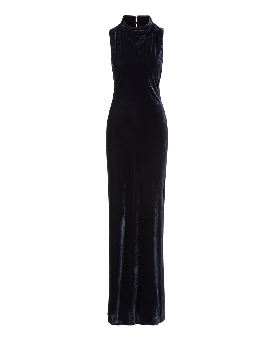 The best-selling Kura is back, now updated in sumptuous navy velvet. This luxe maxi dress combines the ease of a column silhouette—complete with a draped cowl neck—with the rich look and feel of velvet. A keyhole in the back completes the look, upping the seduction factor. Accessorize with strap heels and stacked gold bangles.Â