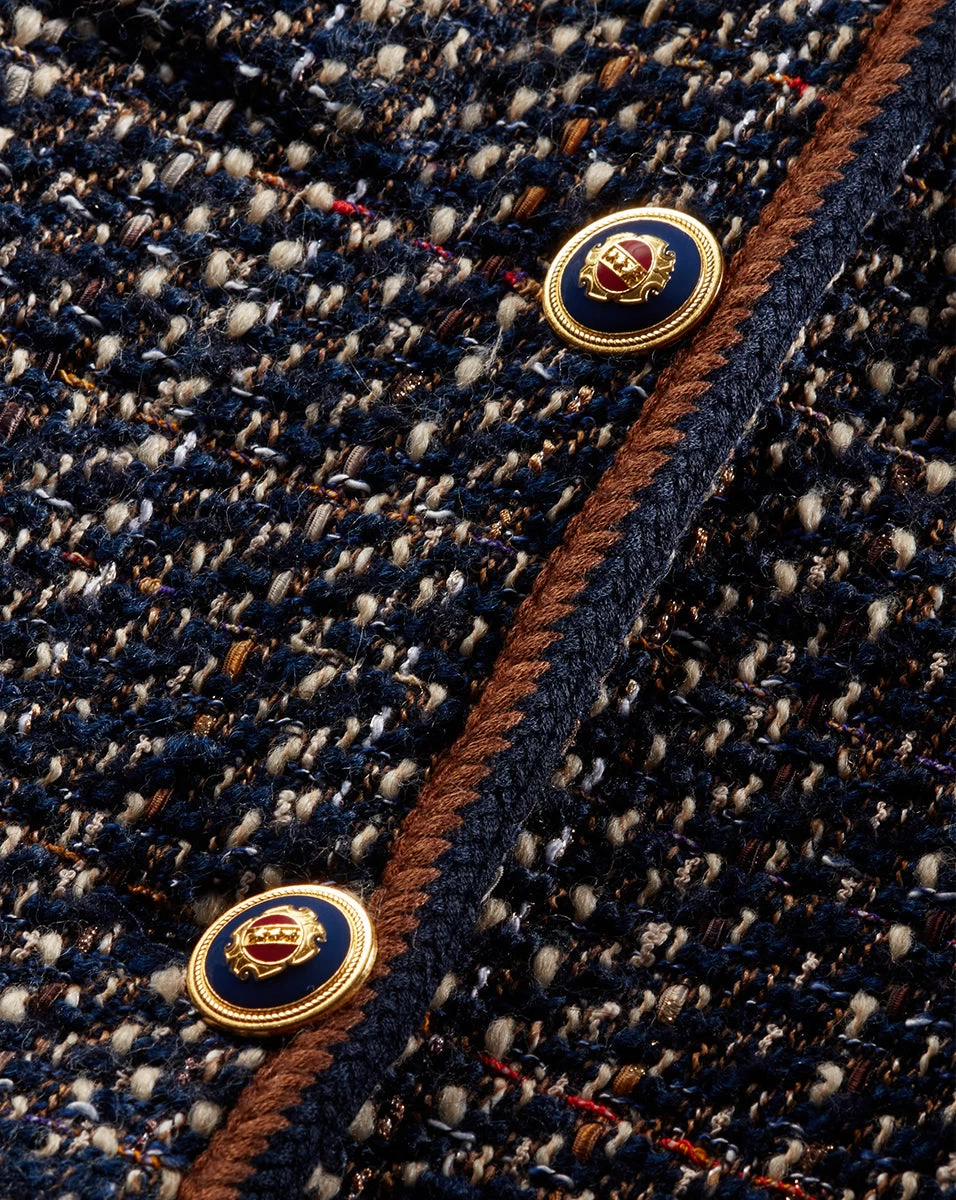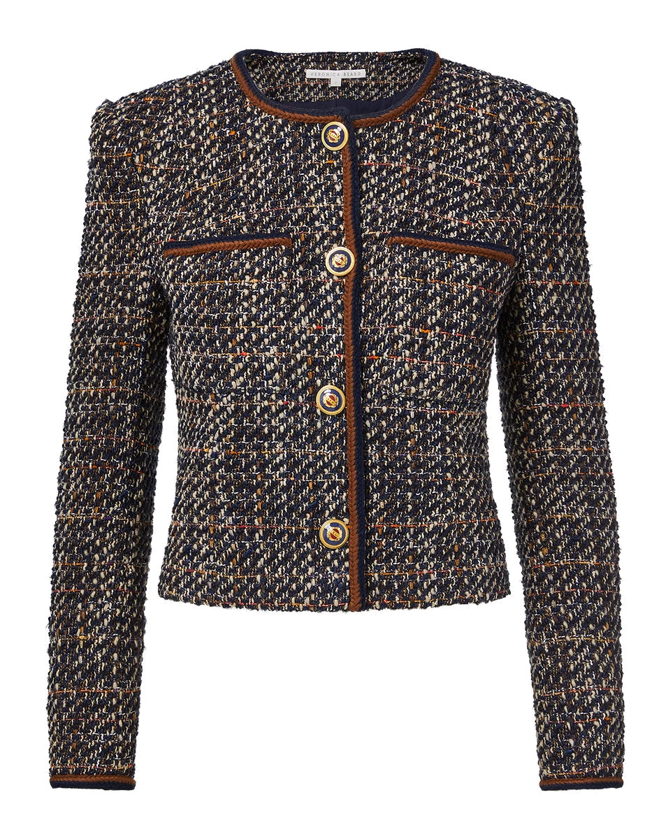 Meet Lars, our fashion-forward take on the classic tweed jacket. Expertly crafted from a luxe blend of bouclé tweed, this standout piece features an elegant collarless design, contrast-color piping and slit pockets at the chest. Peaked shoulders, our new logo crest buttons and allover flecks of color further its sophisticated, feminine appeal. Wear with the coordinating skirt or try it with distressed jeans and clogs for a trend-setting moment.