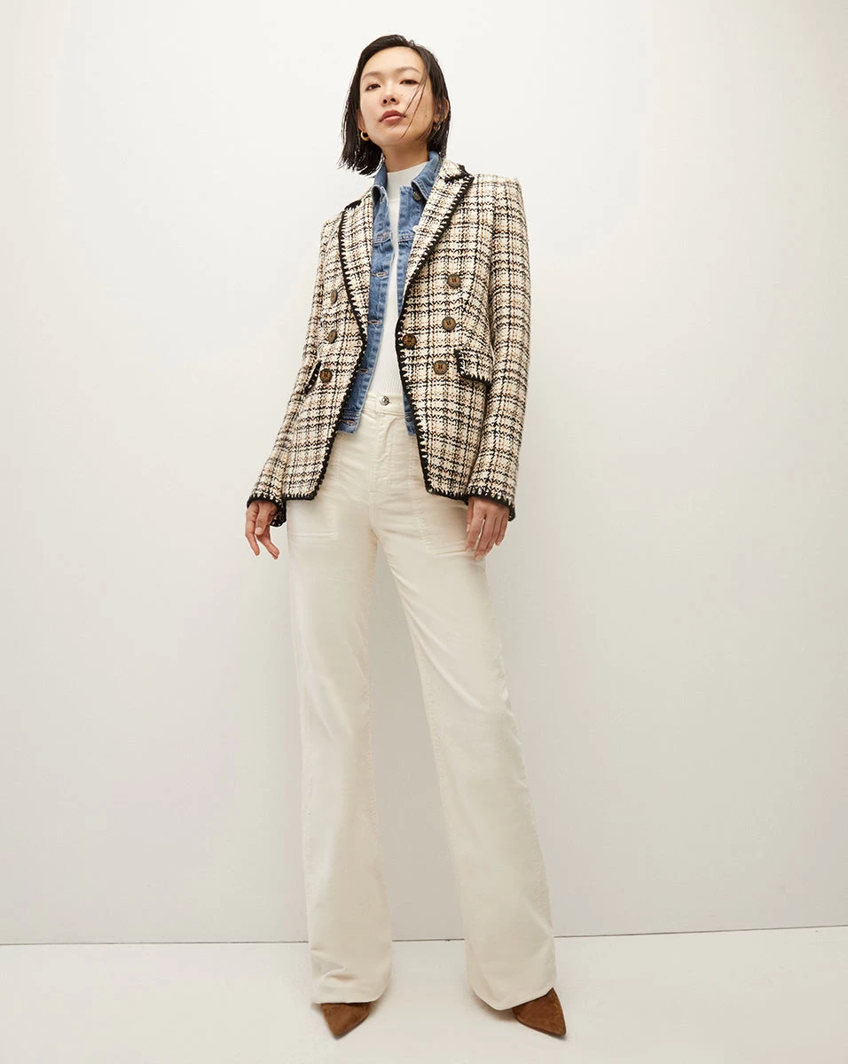 A great tweed jacket is a cornerstone of every wardrobe. We elevated ours—expertly tailored from a lightweight stretch cotton—with a crochet trim for an uptown-meets-downtown vibe. A wide notched lapel, flap pockets and our signature crest buttons complete the look. The neutral plaid, meanwhile, makes this easy to mix and match with anything in your closet. We especially love pairing it with the coordinating skirt for a polished suiting moment.