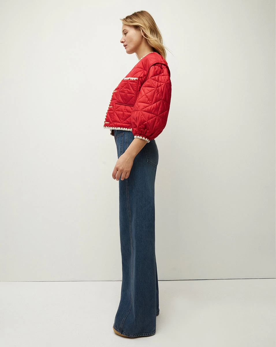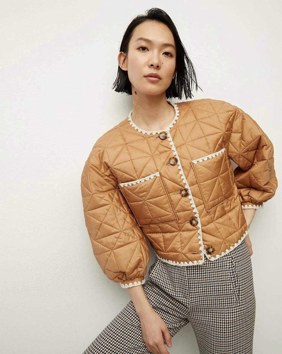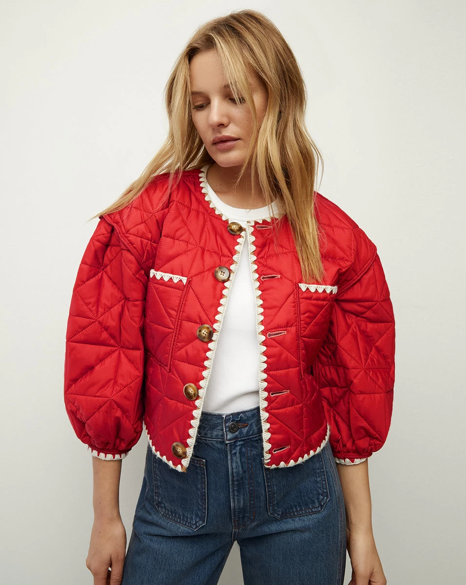 Keep it cool, while staying warm, in our playfully designed Leal jacket. Crafted from quilted lining fabrication, this chic outerwear style features a relaxed fit, along with feminine puffed sleeves. A contrasting embroidered trim adds a craft quality—beautifully juxtaposing the utility of the quilted fabrication. Adding both function and a fashion-forward element to your everyday wear, we love pairing it with a simple jean-and-tee outfit to really elevate your look.
