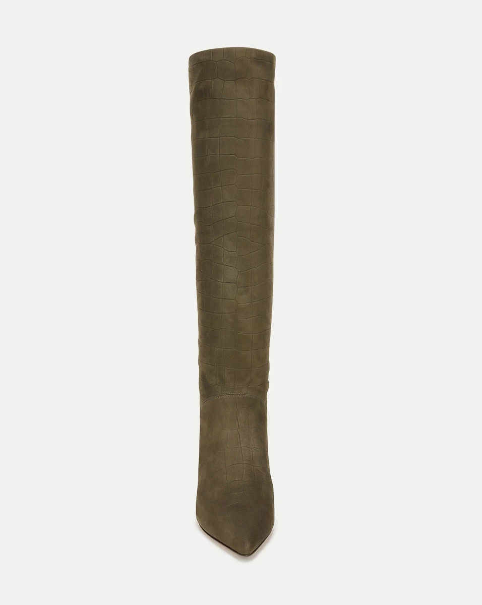 Crafted from croc-embossed leather, the Lexington boots have a minimalist design with pointed toes and 2.75″ stiletto heel. The pull-on style features a classic knee-high silhouette, making it a timless addition to your shoe closet. Ground your feminine floral dresses with these boots for downtown-chic look.