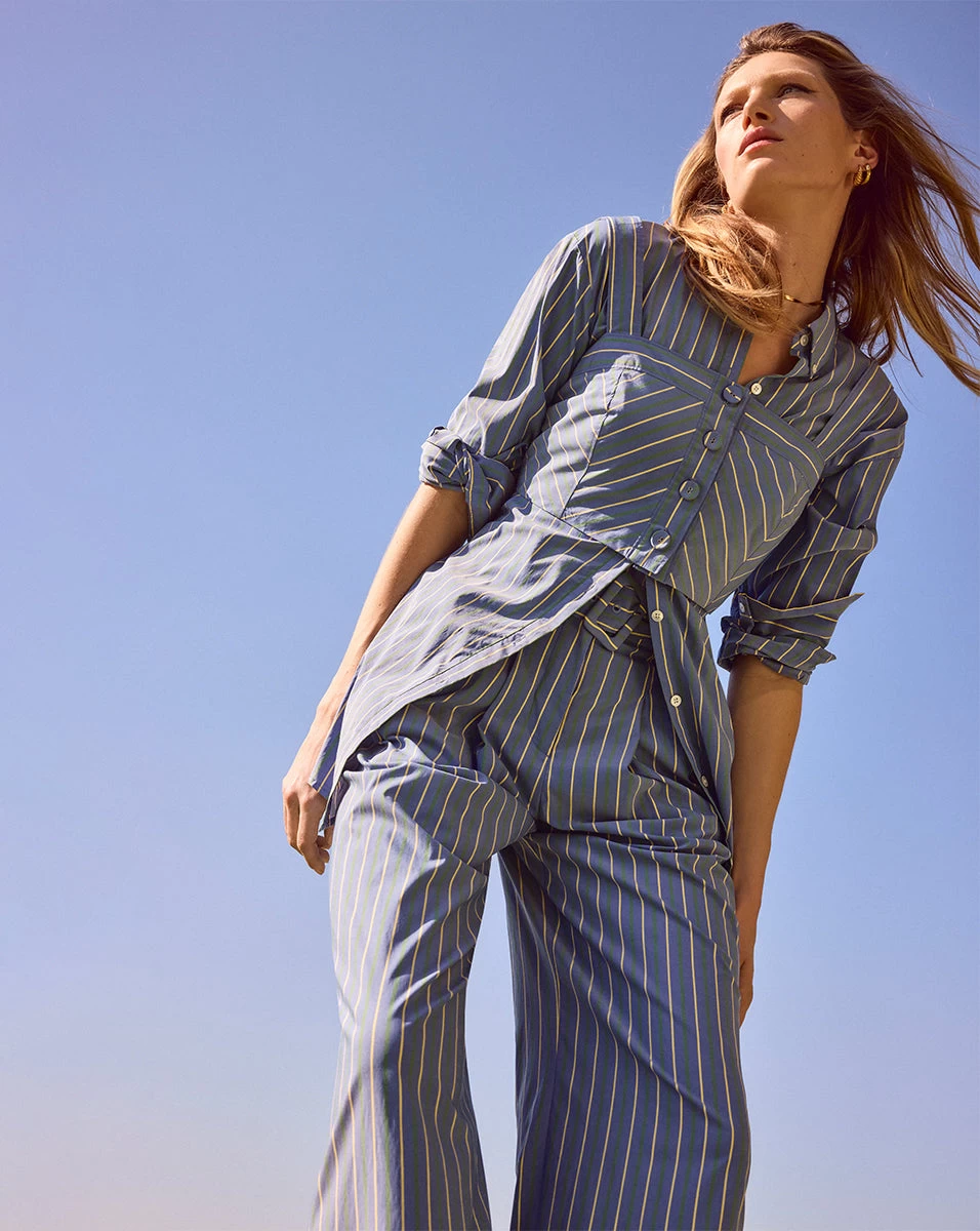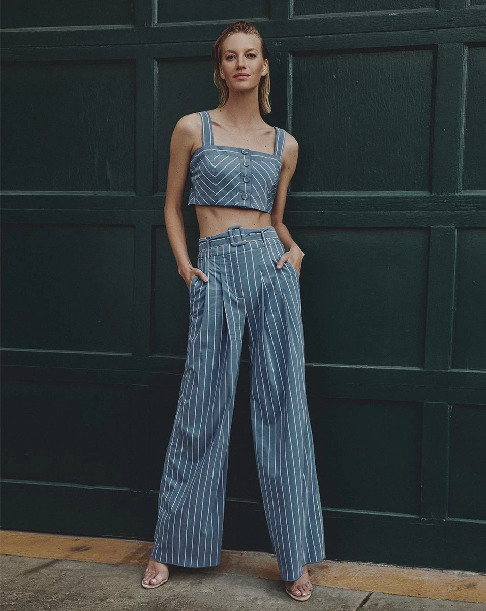 Crafted from an Italian shirting fabric, our Milton balances a masculine fabrication with a feminine silhouette. Its square neckline and cropped length gives it its streamlined silhouette. Fabric-covered buttons finish the look. Wear with its coordinating pants for a matching-set moment and finish with stilettos.