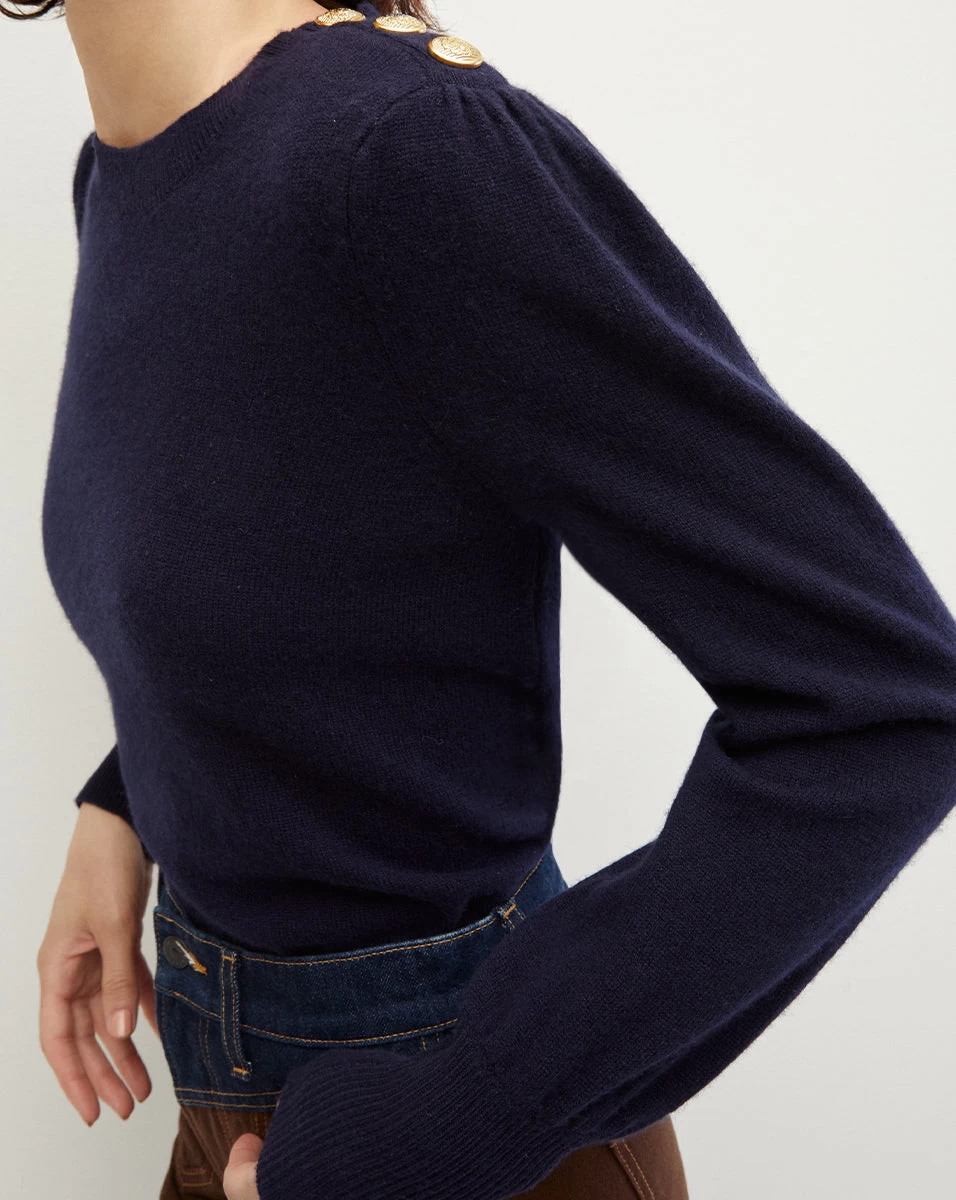 Made from luxury cashmere and updated this season with our signature crest buttons at the shoulder, the Nelia crew-neck sweater is the ultimate foundational wardrobe piece. Featuring a relaxed fit and subtly puffed shoulders, this lightweight knit is a classic you will reach for season after season, year after year. Wear with anything and everything—it’s endlessly versatile.