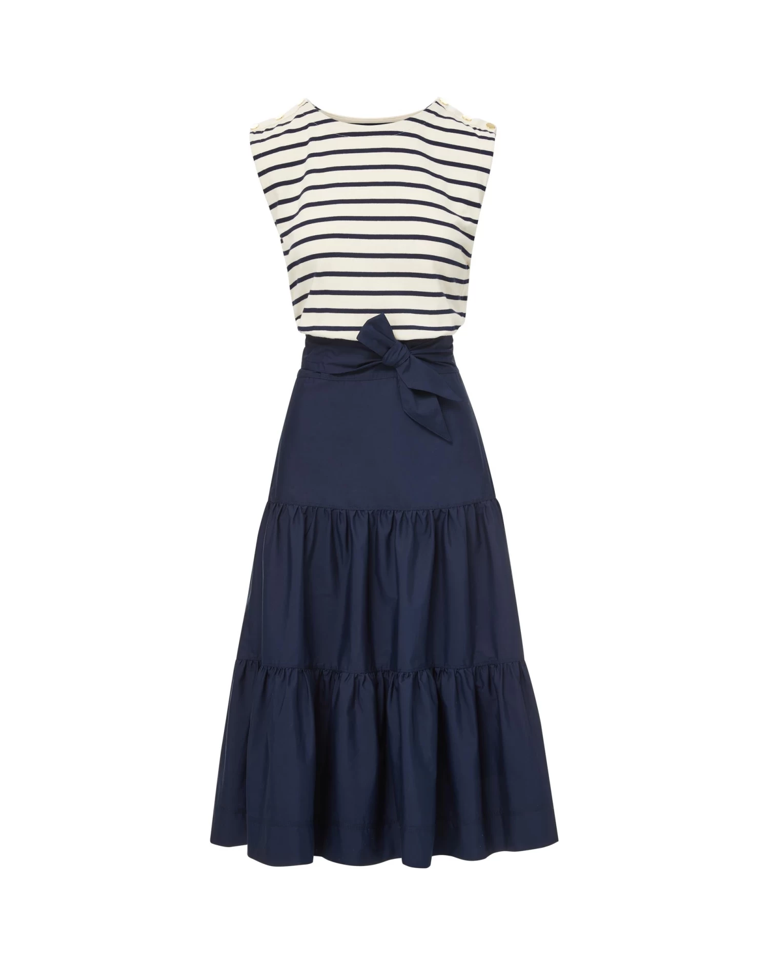 Expertly tailored from 100% cotton, the Pazila is the newest addition to our best-selling series of mixed-media garments. Pre-layered for maximum impact, minimal effort, the dress combines a tiered, flounced midi skirt with a mariner stripe tank. Buttons at the shoulders and a removable sash at the waist complete the look. Pair with platform heels for a girls’ night out—the ultimate in relaxed meets refined.