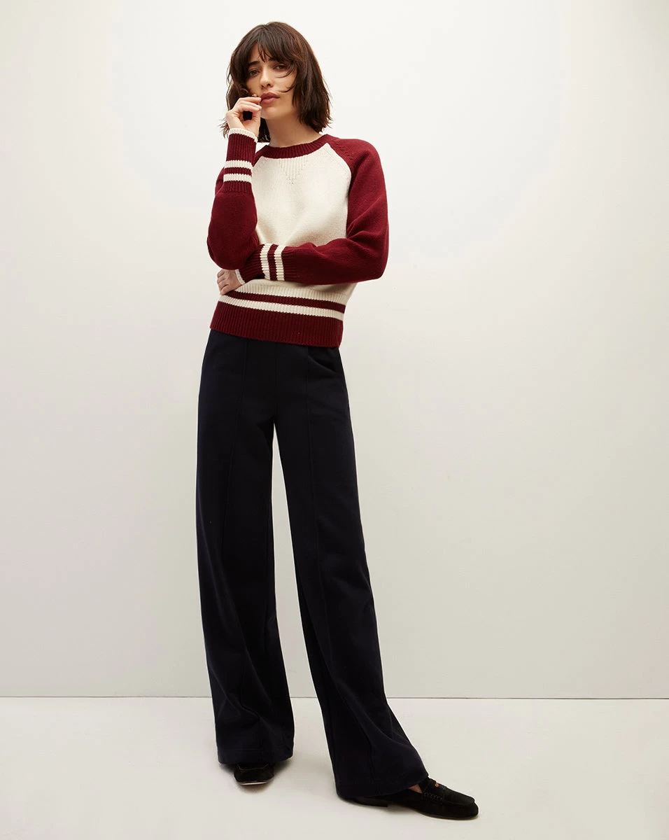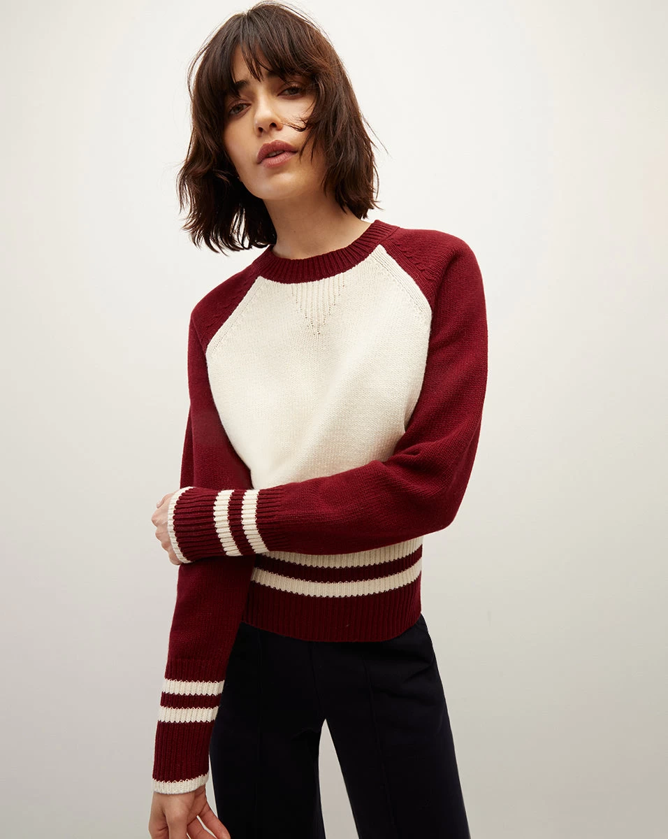 The Ralie pullover is polished answer to lightweight layering. Knit from a wool-blend, this graphic style features contrast color raglan sleeves and striped trims. Wear with jeans and boots for a classic fall look.