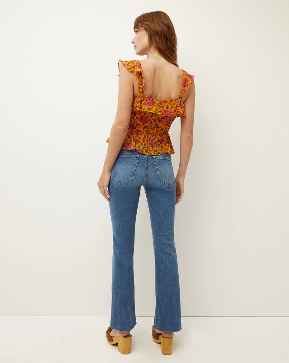 In 100% silk, the Randa is the top you’ll wear on repeat this summer. A charming garden floral is backed by a bright orange hue—perfect for that summer glow. This neckline features soft cascading ruffles that create soft texture and dimension. A flirty peplum hem and invisible side zip complete the look. Style with your favorite jeans and stilettos and you’re ready for your next night out.