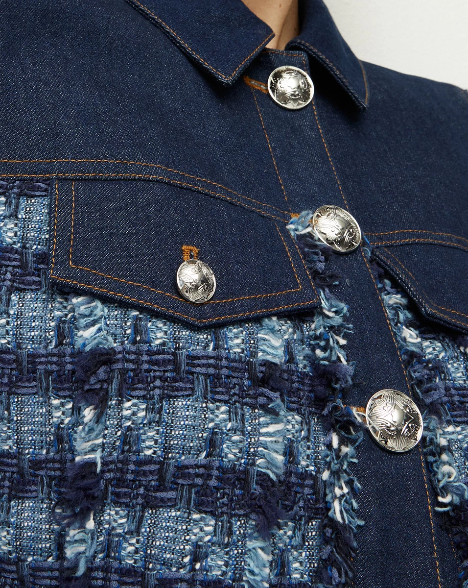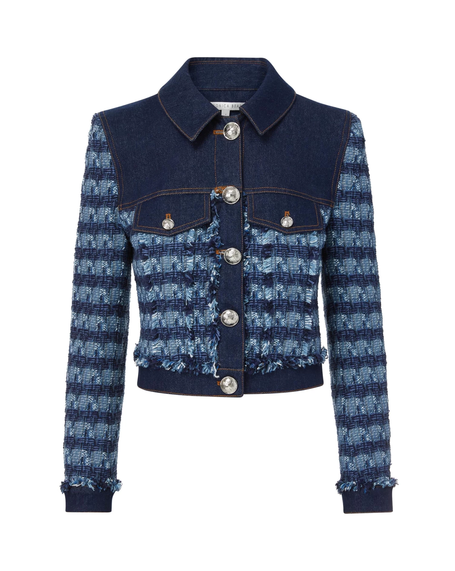 Two classics, one innovative new must-have. We spliced our favorite jean jacket onto the iconic tweed jacket for a look that’s the ultimate in relaxed-meets-refined. Consider the Santo a master class in precision tailoring—complete with a trim collar, contrast-color stitching, padded shoulders and our signature metal crest buttons. Crafted from 100% cotton, this short, boxy style is a wardrobe game-changer, easily dressed up or down. Try it with wide-leg jeans for a new take on double denim.