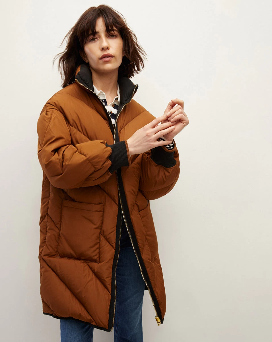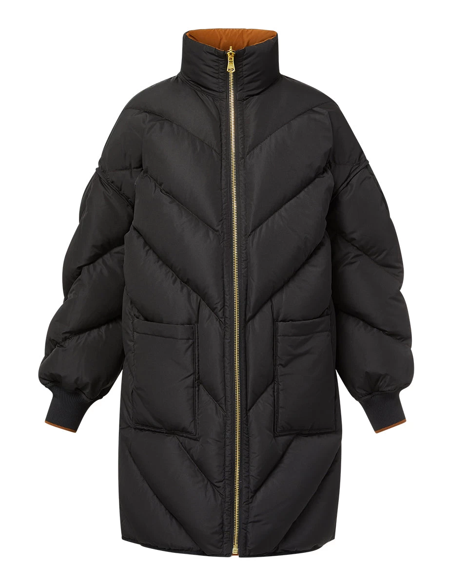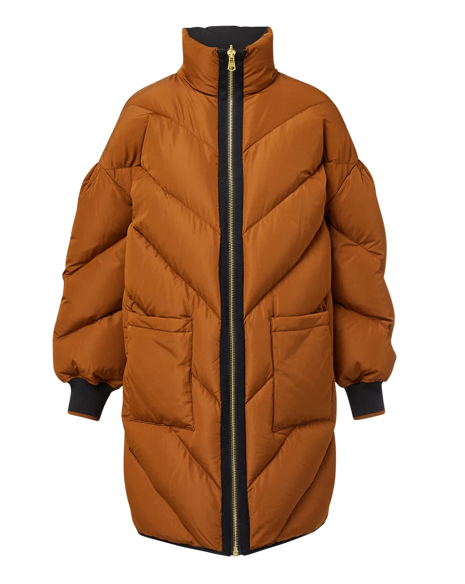 Reversible designs are always at the top of our lists—it’s two looks in one, providing the versatility we all need and love. Our Shanna reversible puffer jacket features one black side and one camel side—both classics, both always chic. A mock neck, patch pockets ,and chevron quilting finish its look. Throw it on over anything and everything, then switch the sides for a whole new look.