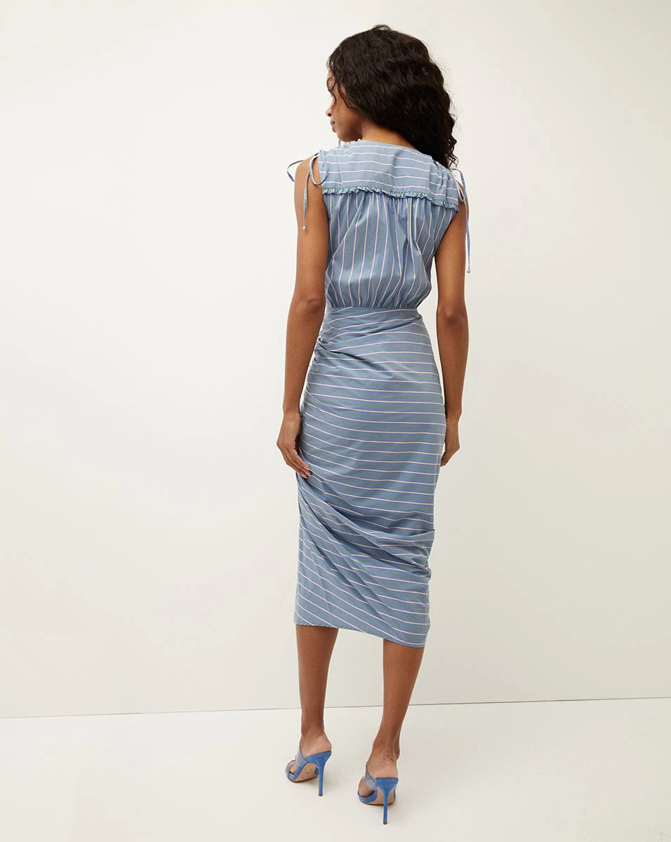 There’s a reason our Teagan dress is a best-seller season after season—the crossover wrap-style top with our signature side ruching provides the most flattering fit, every time. Our latest iteration is made in Italy, in a tri-colored striped shirting fabrication. Ties at the shoulders and waist provide added detail and style. Keep it chic with mules and polished gold jewelry.