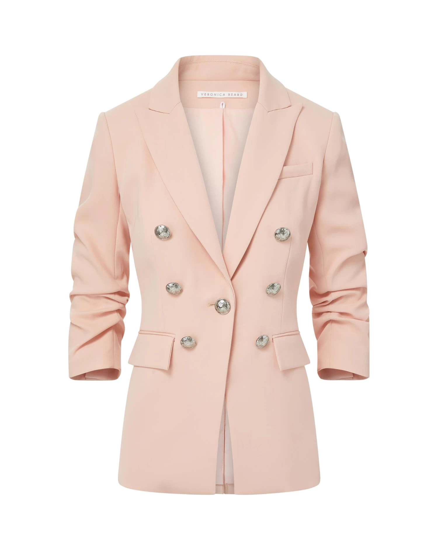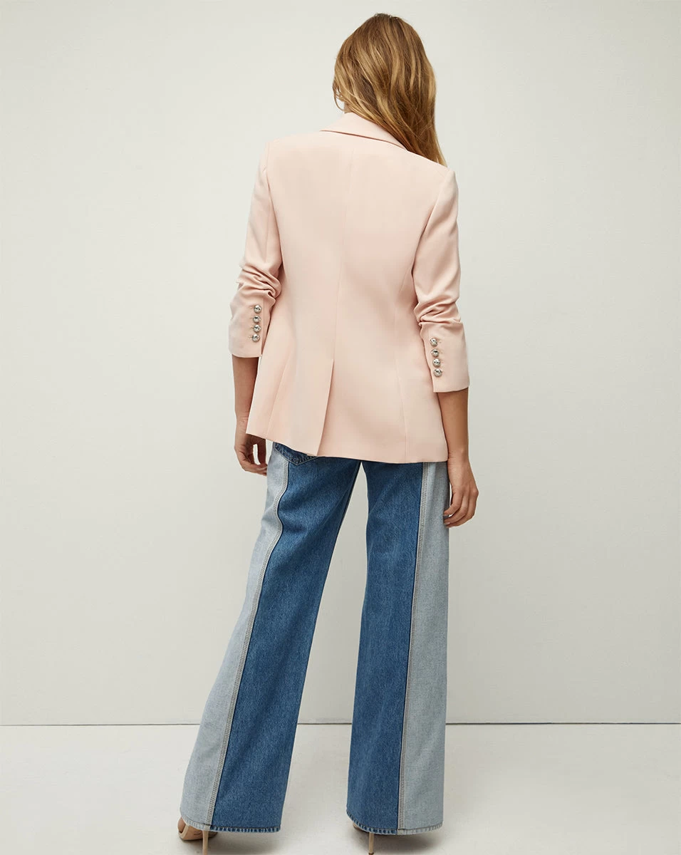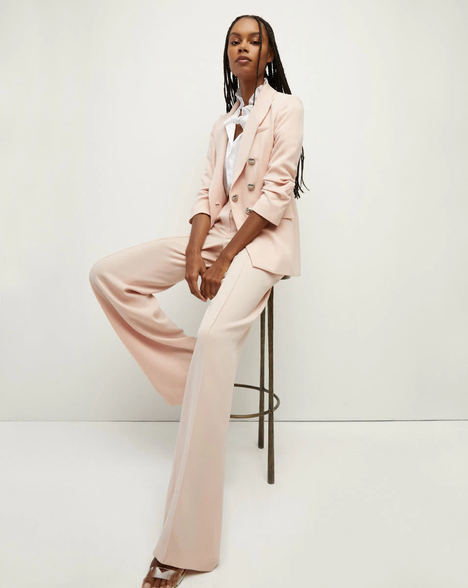 The understated statement suit of the summer. In a soft ballet-pink hue, our Tomi Dickey Jacket is expertly tailored in luxury crepe and made right here in the US. Cut for a structured yet relaxed fit, it features pre-ruched three-quarter length sleeves, a double-breasted silhouette, silver crest buttons, and a longer boyfriend-blazer length. Lean into tonal dressing and wear with its coordinating pant or try it over a floral slip dress.