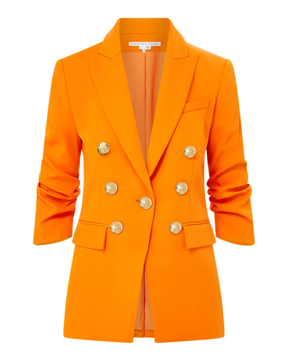 In a vibrant and bold hot orange hue, the Tomi dickey jacket is the ultimate statement maker. With pre-ruched sleeves, a double-breasted silhouette, decorative buttons, and a longer boyfriend blazer length, this perfectly tailored yet slightly relaxed style is a wardrobe game changer. Wear with its coordinating pant or try it with a pair of distressed jeans and stilettos for girls’ night out.