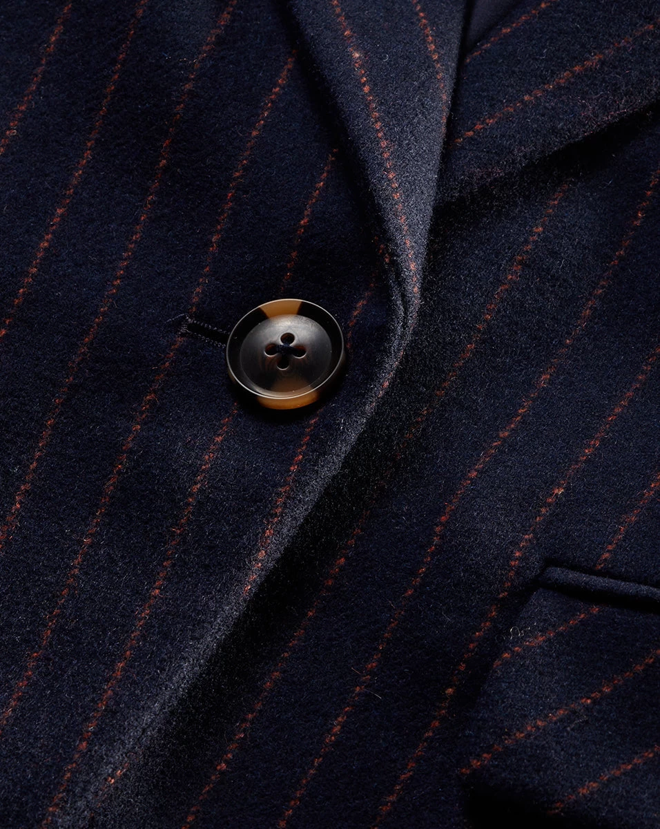 The Tyra is the versatile closet hero you’ll come back to season after season, year after year. Expertly tailored in a luxe wool blend, this single-breasted jacket features classic pinstripes against a streamlined, slim-fit silhouette. Padded shoulders, flap pockets and a notched lapel complete the look. A timeless layering essential, this goes with anything and everything, but we especially love playing with texture and pairing it with a vegan leather pant and PVC heels.