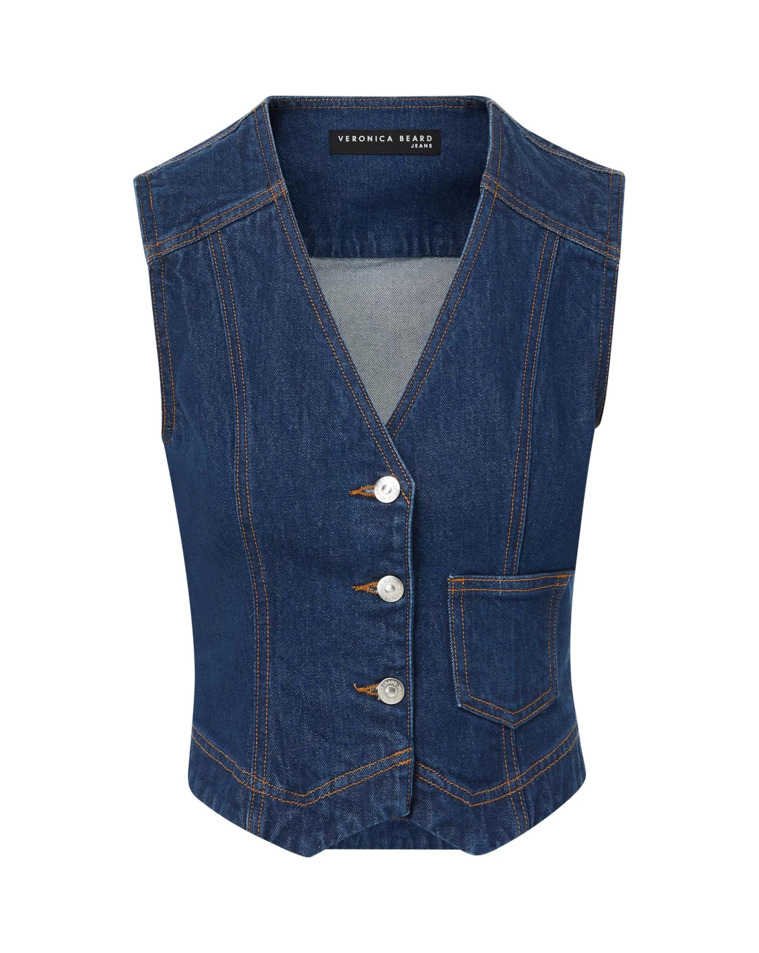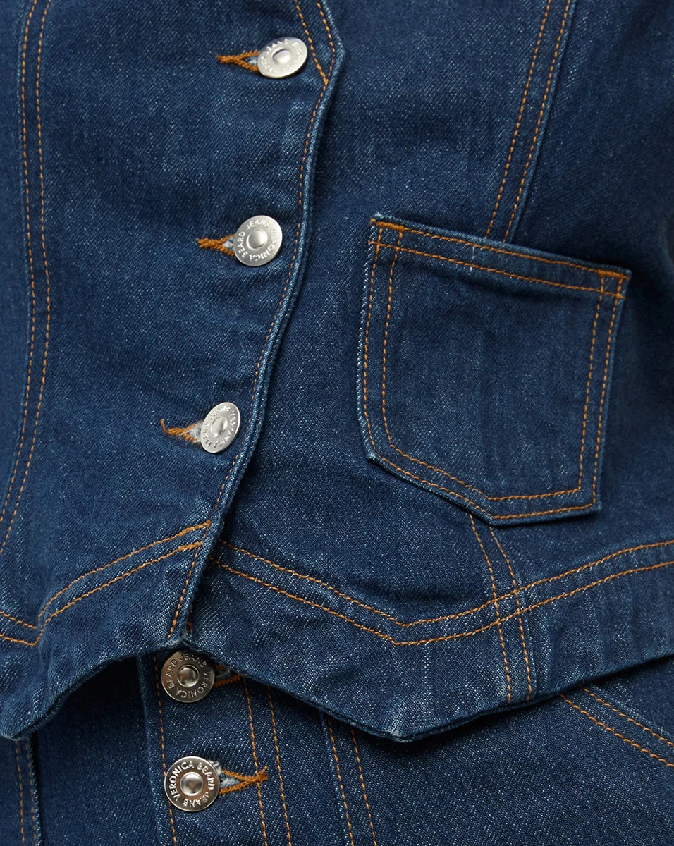Meet the Valeria, the denim vest you didn’t know you needed. Exceptional tailored from comfort-stretch denim, this slim-fit silhouette features a dark wash, contrast-color stitching, a single patch pocket and front-button closures. Great on its on own or as a layering essential, this fashion-forward style will be a timeless addition to your wardrobe. Wear with a floral skirt for prairie chic or pair with jeans for a new take on double denim.
