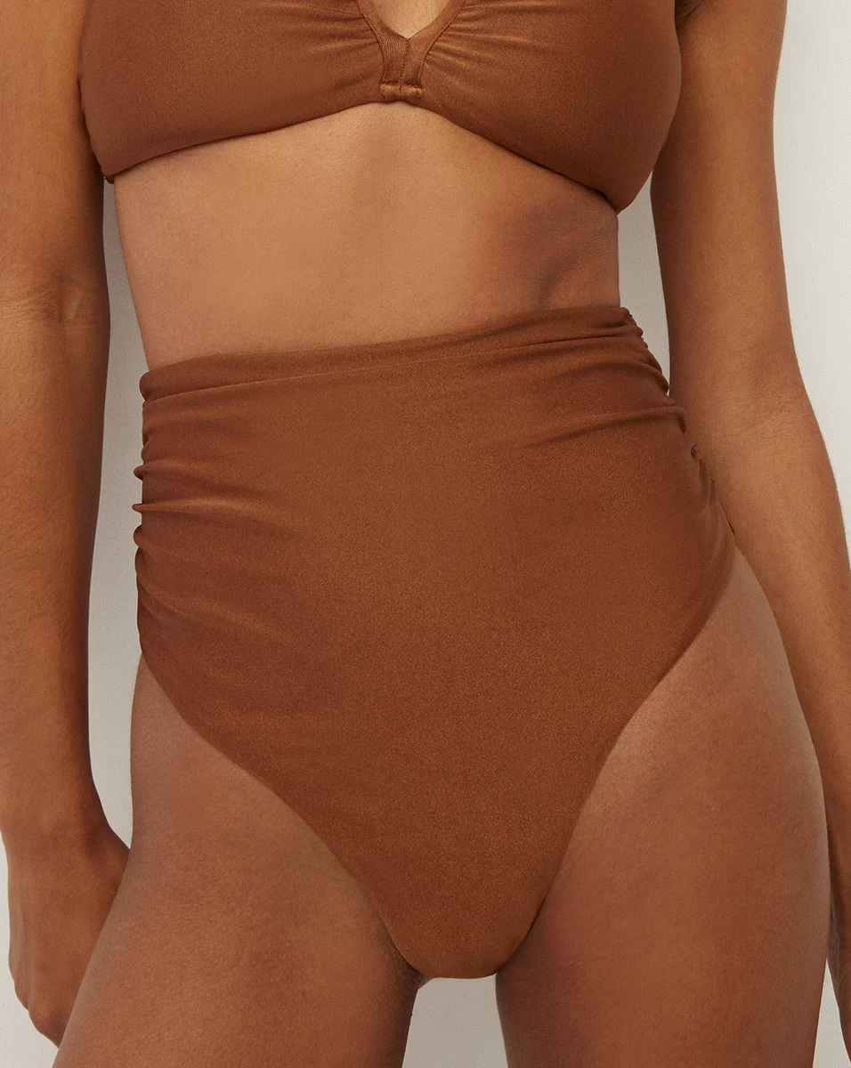 The Varnier is a classic high-waisted bikini bottom—for when you want that secure waist-cinching effect. Our signature side ruching furthers the effect and forgives right where you need it. The golden-sand hue makes it a timeless go-to. Pair with the Malti top, and this style will be your go-to all summer.